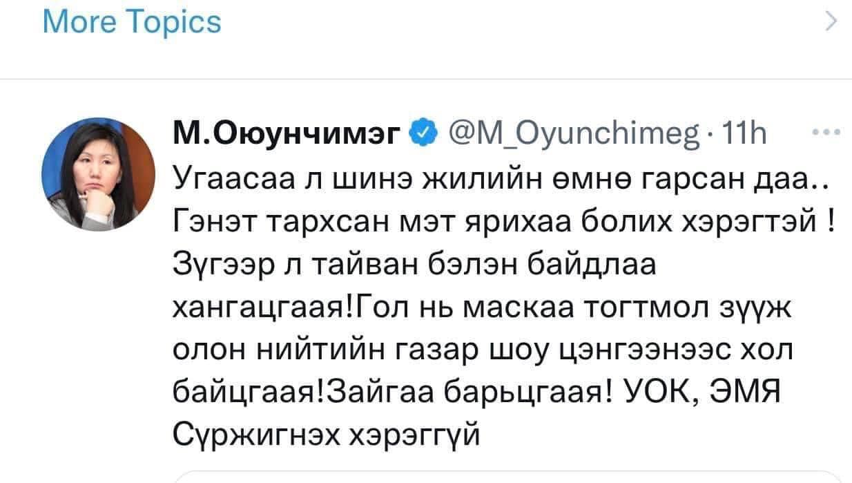 УИХ-ын гишүүн М.Оюунчимэг “Монголын Засгийн газар өнгөрсөн сард омикрон тархсан байсныг нуусан” гэх утга бүхий жиргээг твиттер хуудастаа оруулсан байдаг. Тодруулбал, тэрбээр “Угаасаа л шинэ жилийн өмнө тархсан байсан л даа. Гэнэт тархсан мэт ярихаа болих хэрэгтэй. Зүгээр л тайван бэлэн байдлаа хангацгаая. Гол нь амны хаалтаа тогтмол зүүж, олон нийтийн газар, шоу цэнгээнээс хол байцгаая. Зайгаа барьцгаая. УОК, ЭМЯ сүржигнэх хэрэггүй” гэж бичсэн билээ.
