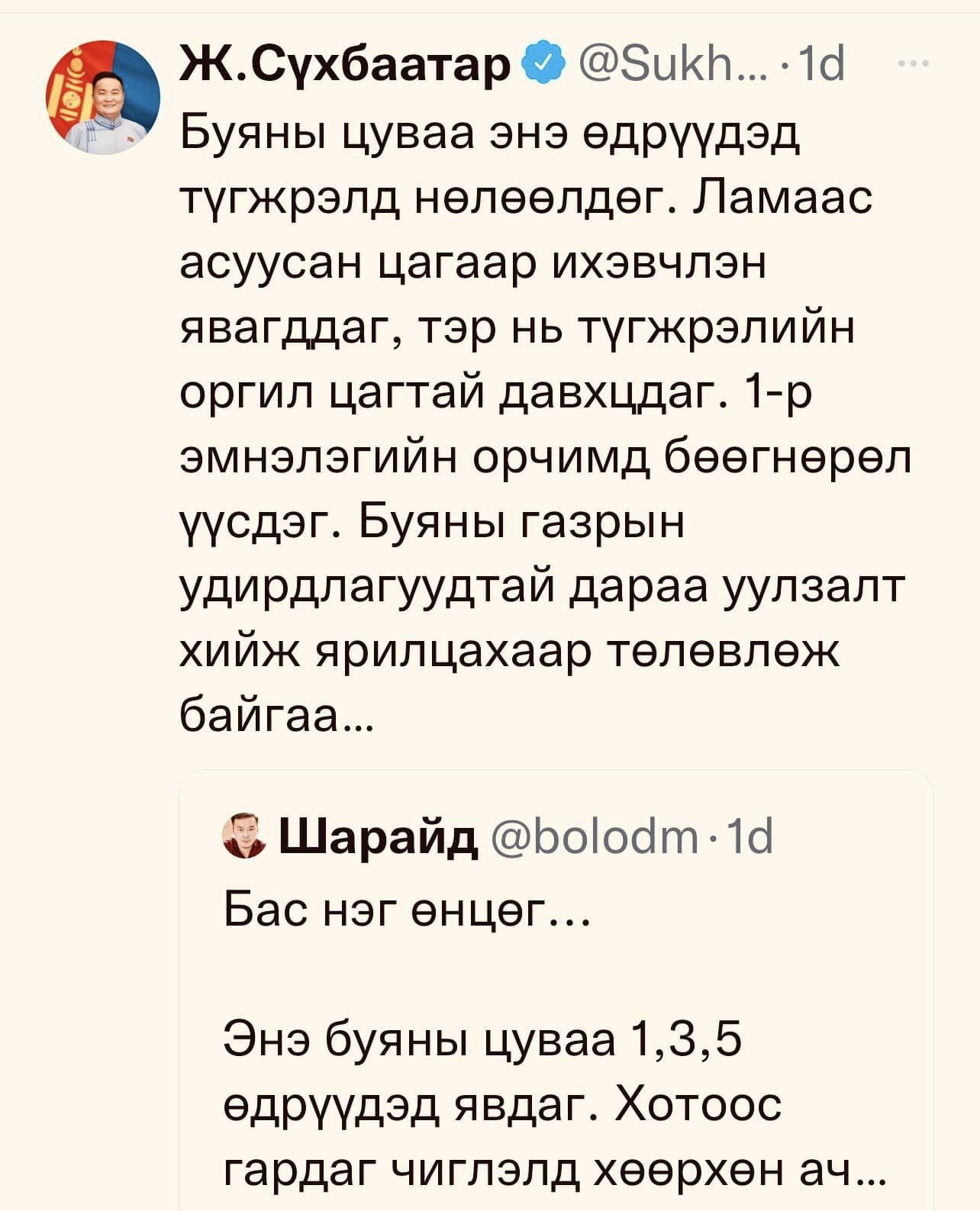 Нийслэлийн асуудал хариуцсан сайд Ж.Сүхбаатар өчигдөр Төвлөрөл сааруулах, түгжрэлийн эсрэг Үндэсний хорооны хорооны тамга, тэмдгээ ЗГХЭГ-ын дарга Д.Амарбаясгаланаас хүлээн авсан. Тэгвэл тус хороо өнөөдөр хуралдаж, Засгийн газрын хуралдаанд оруулах зарим асуудлыг хэлэлцсэн байна. Үүнтэй холбоотой Нийслэлийн асуудал хариуцсан сайд Ж.Сүхбаатар өөрийн цахим хаягаараа дамжуулж, "Буяны цуваа энэ өдрүүдэд түгжрэлд нөлөөлдөг. Ламаас асуусан цагаар ихэвчлэн явагддаг, тэр нь түгжрэлийн оргил цагтай давхцдаг. Улсын нэгдүгээр төв эмнэлэгийн орчимд бөөгнөрөл үүсдэг. Буяны газрын удирдлагуудтай дараа уулзалт хийж ярилцахаар төлөвлөж байгаа…" хэмээн жиргэсэн нь олны дургүйцлийг төрүүлээд буй.