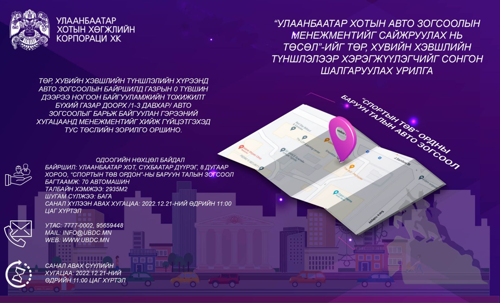 Сонгон шалгаруулалтад оролцох хүсэлтэй хуулийн этгээд/түншлэл нь сонгон шалгаруулалтын баримт бичигт заасан техникийн болон санхүүгийн чадвартай байх шаардлагатай. Баримт бичгийн үнийг төлж сонгон шалгаруулалтын материалыг доорх хаягХаяг: “Улаанбаатар хотын хөгжлийн корпораци” ХК 905 тоот, 9 давхар, Хангарди ордон, Нийслэлийн засаг захиргааны II байр, Жигжиджавын гудамж, Бага тойруу – 15160, 1 дүгээр хороо, Чингэлтэй дүүрэг, Улаанбаатар хот, Монгол Улс.