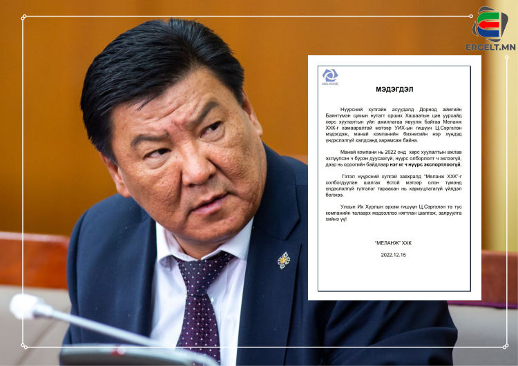 “Меланж” ХХК дараах мэдэгдэлдээ “Нүүрсний хулгайн асуудалд Дорнод аймгийн Баянтүмэн сумын нутагт орших Хашаатын цав уурхайд хөрс хуулалтын үйл ажиллагаа явуулж байгаа “Меланж” ХХК-г хамааралтай мэтээр УИХ-ын гишүүн Ц.Сэргэлэн мэдэгдэж, манай компанийн нэр хүндэд үндэслэлгүй халдсанд харамсаж байна. Манай компани нь 2022 онд хөрс хуулалтын ажлаа эхлүүлсэн ч бүрэн дуусаагүй, нүүрс олборлолт ч эхлээгүй учир нэг ч киллограмм нүүрс экспортлоогүй. Гэтэл нүүрсний хулгайн завхралд “Меланж” ХХК-г холбогдуулан шалгах ёстой мэтээр олон түмэнд үндэслэлгүй гүтгэлэг тараасан нь хариуцлагагүй үйлдэл болжээ. УИХ-ын гишүүн Ц.Сэргэлэн та тус компанийн талаарх мэдээллээ нягтлан шалгаж, залруулга хийнэ үү” гэжээ.