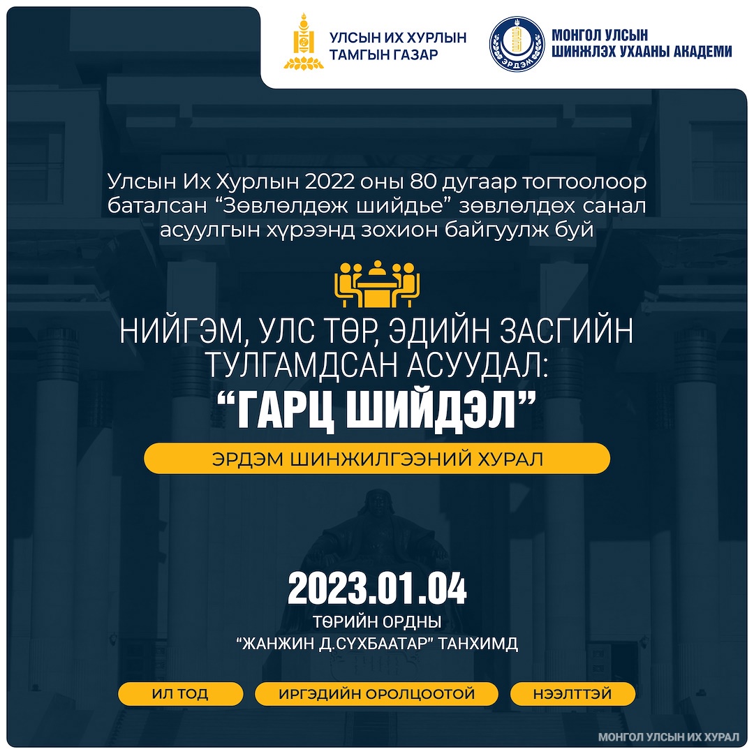 | “Нийгэм, улс төр, эдийн засгийн тулгамдсан асуудал: Гарц, шийдэл” сэдэвт эрдэм шинжилгээний хурал болно |