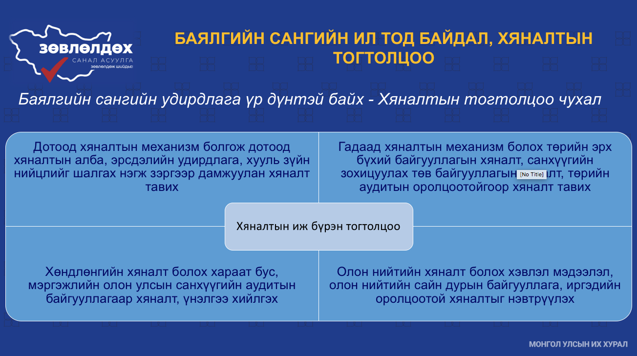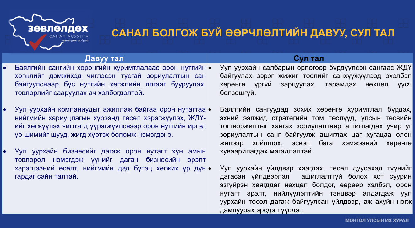 2019 оны Үндсэн хуульд оруулсан нэмэлт, өөрчлөлтийн хүрээнд газрын хэвлийн баялгийн үр, өгөөжийг үндэсний баялгийн санд төвлөрүүлж, иргэдэд тэгш хүртээх ёстой гэсэн зарчмыг агуулсан заалт тусгасан. Баялгийн санд төвлөрүүлсэн хөрөнгийг нийгмийн хамгааллыг сайжруулах, ядуурлыг бууруулах, ажлын байрыг нэмэгдүүлэхэд зарцуулах нь зөв үү гэдэгт та бүхэн санал бодлоо хуваалцаж, шийдвэр гаргах ёстой гэдгийг онцлоод үндэсний баялгийн сангийн давуу болон сул талын талаар танилцуулсан.