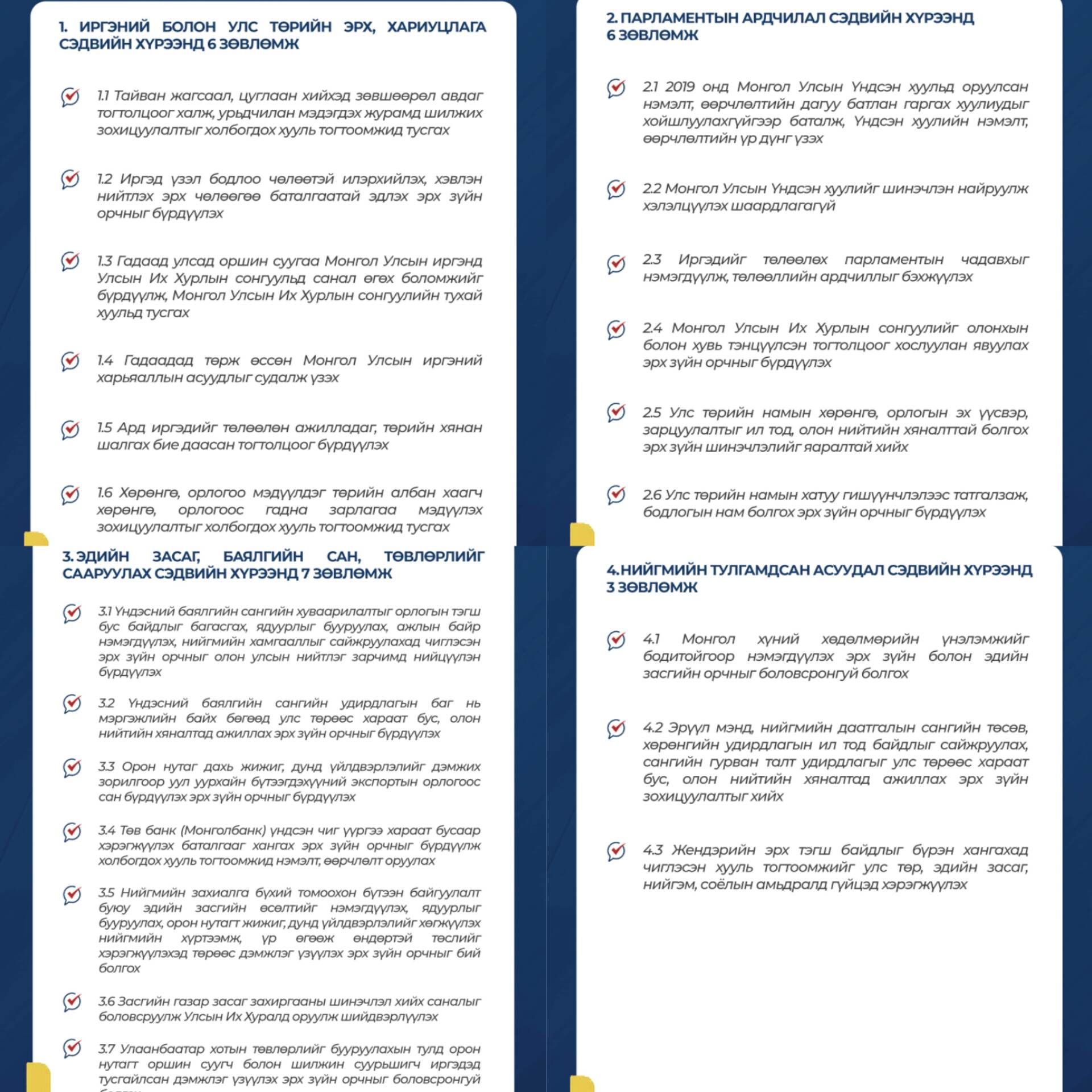 -Эхний шатны санал асуулгад оролцсон 1570 хүн бол олон улсын жишгээр боломжит хувилбар гэж ҮСХ тайлбарласан. Эхний шатанд оролцогчид ямар ч мэдээлэл аваагүй, тухайн үедээ өөрт байгаа баримжаа, мэдээллээр санал өгсөн бол хоёр дахь шатанд оролцогчдыг хоёр өдөр мэдээллээр хангаад санал авсан. Үүнийг МҮОНТ-ээр шууд дамжуулсныг та бүхэн мэдэж байгаа. Зөвлөлдөх зөвлөлийн гишүүд бид тус санал асуулгыг хийх бэлтгэл ажлын хүрээнд зохион байгуулсан эрдэм шинжилгээний хурал, үндэсний чуулга уулзалтаас эрдэмтэд, улс төрийн намууд, иргэдийн гаргасан санал, мөн тухайн үед төв талбайд жагсаал, цуглаан хийж байсан хүмүүсээс тавьсан саналыг нэгтгэж, Зөвлөлдөх санал асуулгын 22 асуултыг боловсруулсан. Энэ 22 асуулт тус бүр дээр дөрвөн ангиллаар оролцогчид 15, 15-аар бүлэг болж хуваагдан хоорондоо ярилцаж, үзэл бодлоо хуваалцсаны дараа хоёр дахь шатны санал асуулгыг явуулсан. Ингэхэд нэгдүгээр шатанд авсан зарим саналын хувь буусан, зарим нь өссөн байна. Яг эндээс л бид ямар асуудлыг эрэмбэлж гаргах вэ гэдгийг харлаа. Миний хувьд 22 асуултыг төгс төгөлдөр байсан гэж хэлж чадахгүй. Боловсруулах явцад Зөвлөлдөх зөвлөлийн гишүүдийн дунд маргаан байсан ч олонхоороо шийдье гэдэг нэг л зарчим барьж ажилласан. Миний эхний дүгнэлт бол санал асуулга амжилттай боллоо. Олон нийтийн санаа бодлыг ядаж 50 хувь илэрхийлж чадсан байх гэж харж байна. Жишээлбэл би Монголын улс төр, нийгмийг гаднаас нь шүүмжилдэг хүмүүсийн нэг. Жагсагчид олон шүүмж хэлж, шаардлага тавьдаг. Тэгэхээр энд нэг асуудал байна. УИХ-д хууль боловсруулж, баталдаг хүмүүсийн өмнөөс бид зөвхөн сэтгэл хөөрлөөр тэгж болохгүй, ингэж болохгүй гэж асуудал тавьж болохгүй. Яагаад гэвэл бүх зүйл хуулийн хүрээнд явах ёстой учраас олон шаардлага, шүүмжлэл ихэнх тохиолдолд биелэгддэггүй. Би Зөвлөлдөх зөвлөлд ажиллаад юуг ойлгосон бэ гэвэл, иргэд бид өөрсдөө хариуцлагатай байх ёстой юм байна. Бид жагсаад, нэгдээд тодорхой асуудал тавих гэж байгаа бол судлах хэрэгтэй юм байна. Хуулийн хүрээнд ямар заалт байна вэ, энэ яагаад амьдрал дээр болохгүй байна вэ гэдгийг мэдээлэлтэй байж, нухацтай судлан хандах ёстой юм байна. Гарц шийдлийг хуулийн хүрээнд гаргах ёстой. Түүнээс биш нь та нар болохгүй байна, та нар огцор гэж мянга хашгираад үр дүнд хүрэхгүй юм байна. Сая Зөвлөлдөх зөвлөл гэдэг бүтцээр дамжуулаад УИХ болоод ард түмний дундын жийргэвч маягтай ажиллаж үзлээ. Эндээс надад төрсөн бодол бол бид дандаа төрийг буруутгаад байхаас илүүтэй үүргээ биелүүлээд, хариуцлагатай эв нэгдэлтэй байж, асуудлыг хуулийн хүрээнд гаргаж тавьсан тохиолдолд ойлголцолд хүрэх юм байна гэж ойлголо. Эс тэгвэл жагсаал цуглаан дээр хүртэл асуудал зөвөөр хөндөгдөж байгаа ч үр дүнд хүрэхгүй. Хуульчид, судлаачид шиг тоо баримт, хууль зүйн үндэслэлтэй нь ярьж, гаргалгаа гаргаад явж яагаад болохгүй байгаа юм. Зүгээр л хэдэн хүнийг урдаа гаргачхаад ард алга ташаад зогсоод байж болохгүй шүү дээ. Үнэхээр л энэ нийгмийг өөрчилье гэж бодож л байгаа юм бол хүний бүрийн оролцоо, хариуцлага байх ёстой юм байна.