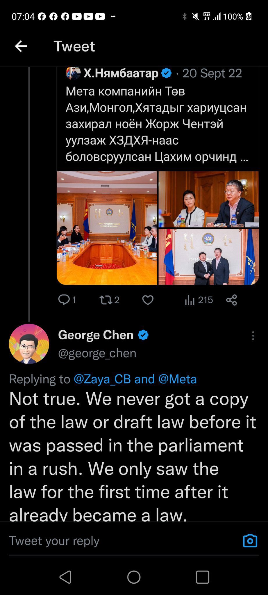 Хууль зүй, дотоод хэргийн сайд Х.Нямбаатар өнгөрсөн 2022 оны есдүгээр сард цахим хуудастаа “Мета компанийн Төв Ази, Монгол, Хятадыг хариуцсан захирал ноён Жорж Чентэй уулзаж, ХЗДХЯ-наас боловсруулсан Цахим орчинд хүний эрхийг хамгаалах тухай хуулийн төсөл дээр хамтарч ажиллах, Мета платформын мэдээллийн аюулгүй байдлыг хамгаалах багтай хамтарсан Ажлын хэсэг байгуулахаар боллоо" гэж жиргэсэн байдаг.