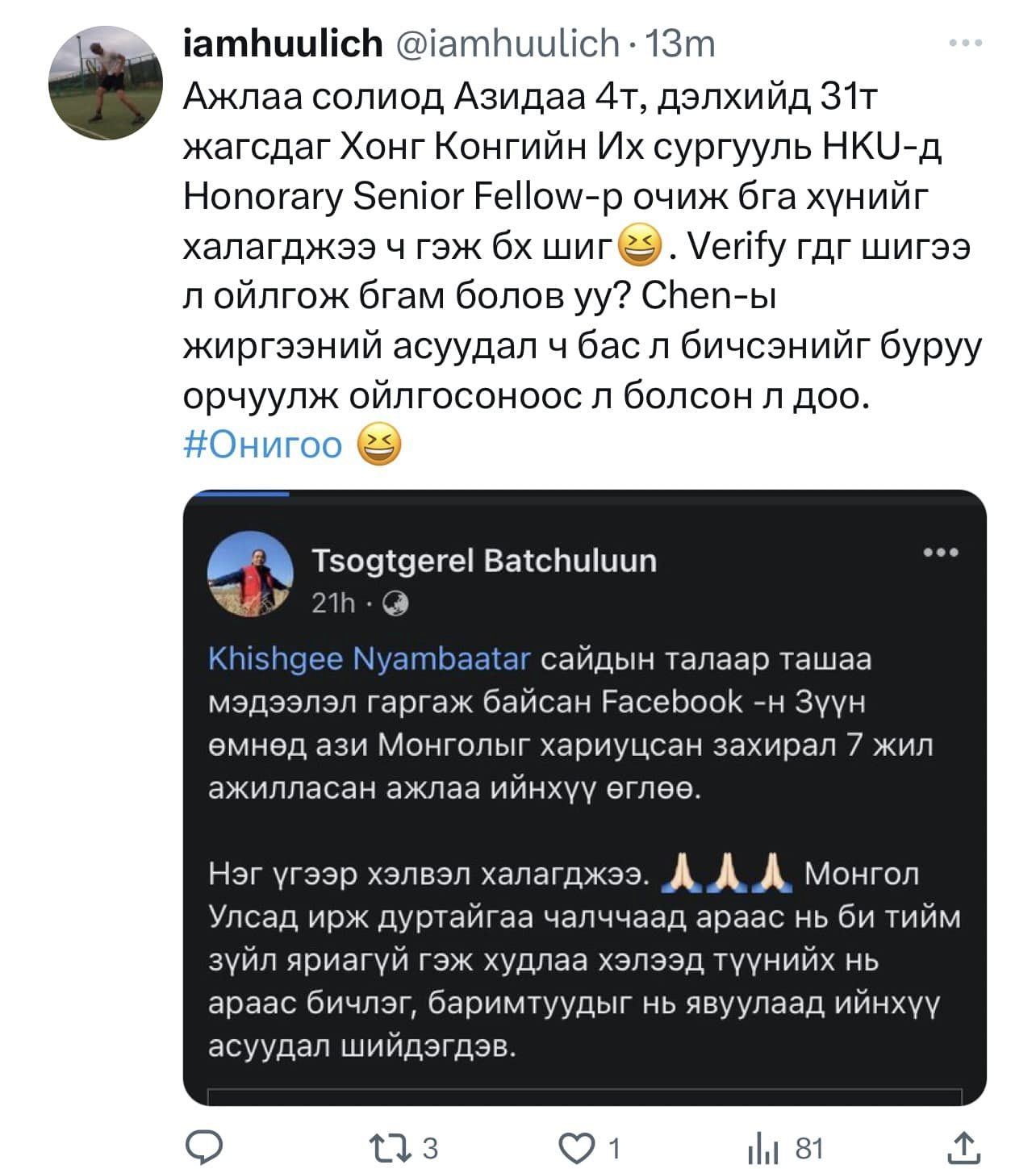 Нэг үгээр бол, тэрбээр Ази тивийн алдартай сургуулийн нэг болох Хонконгийн их сургуулийн Иргэний нийгэм, засаглалын төвийн ахлах ажилтан болж, тушаал дэвшжээ.