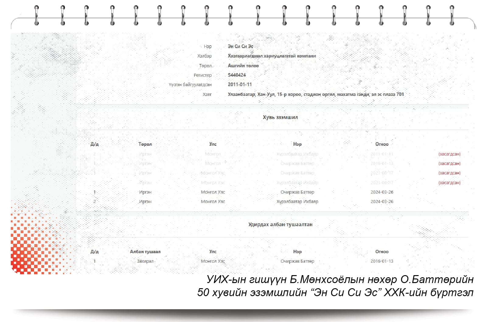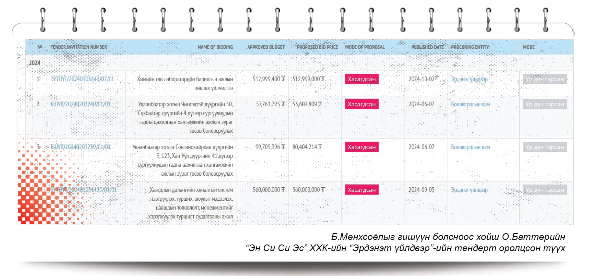 УИХ-ЫН ГИШҮҮН Б.МӨНХСОЁЛЫН НӨХӨР О.БАТТӨРИЙН КОМПАНИ “ЭРДЭНЭТ ҮЙЛДВЭР”-ИЙН ТЕНДЕРҮҮД РҮҮ “ЗҮТГЭХ”-ИЙН УЧИР ЮУ ВЭ