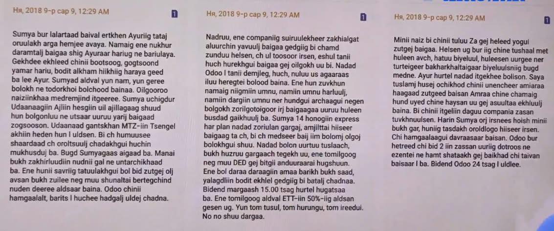 | Б.ЭНХБАЯР: "Эрдэнэс Тавантолгой" ХХК-ийн дарга асан Б.Ганхуяг УИХ-ын дарга Д.Амарбаясгалан руу бичсэн мессежийг баримттай дэлгэж байна |
