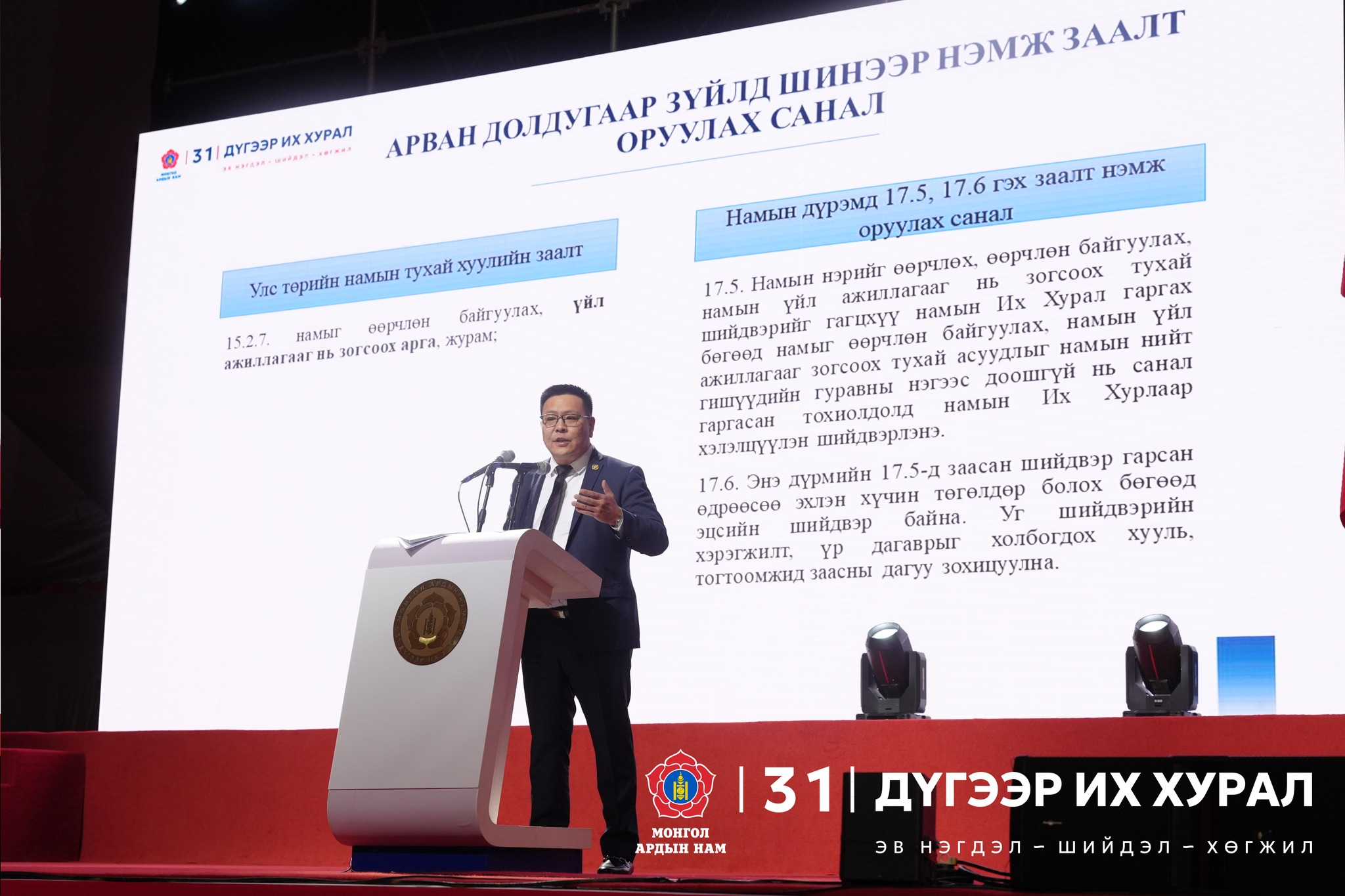 Өнөөдөр Их хурлын төлөөлөгчид Монгол Ардын Намын хөтөлбөр буюу хичээн эрмэлзэх зүйл, намын дүрмийн нэмэлт өөрчлөлтийн талаар хэлэлцэж, Хяналтын ерөнхий хорооны болон Бага хурлын гишүүдийг сонгоно. УИХ-ын гишүүн Б.Баярбаатараар ахлуулсан Ажлын хэсэг намын хороо, үүрүүд, дэргэдэх байгууллагуудаар дамжуулан гишүүдээс санал авч, намын дүрэмд өөрчлөлт оруулах төслийг боловсруулсан бөгөөд 31 дүгээр Их хурлын салбар хуралдаанаар хэлэлцүүлсэн юм. Дээрх дүрэм, хөтөлбөрийн өөрчлөлтийг Улс төрийн намын тухай хуульд нийцүүлэн шинэчилж буйгаараа онцлогтой.