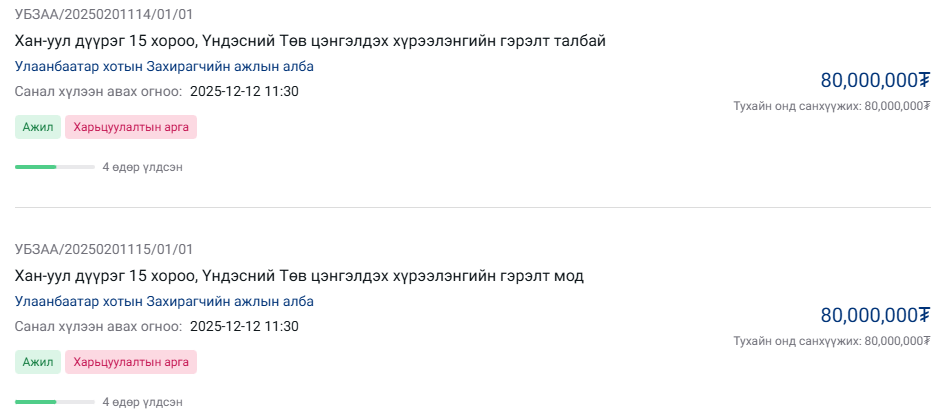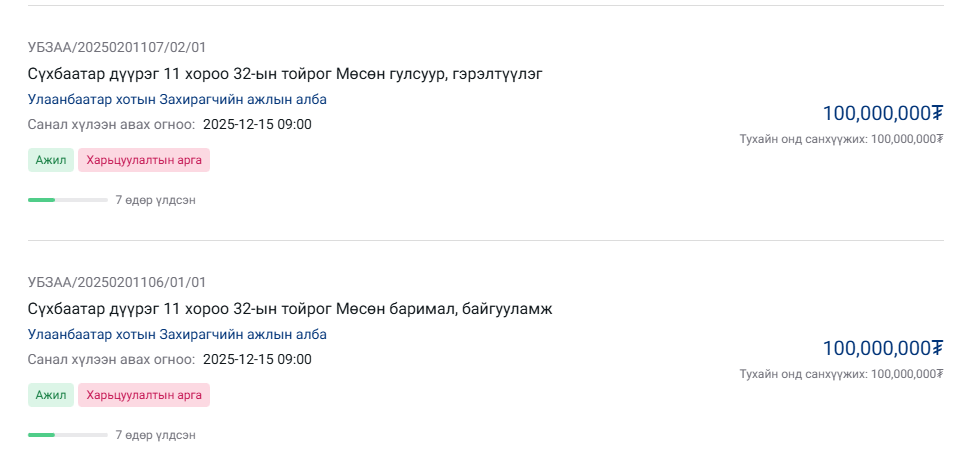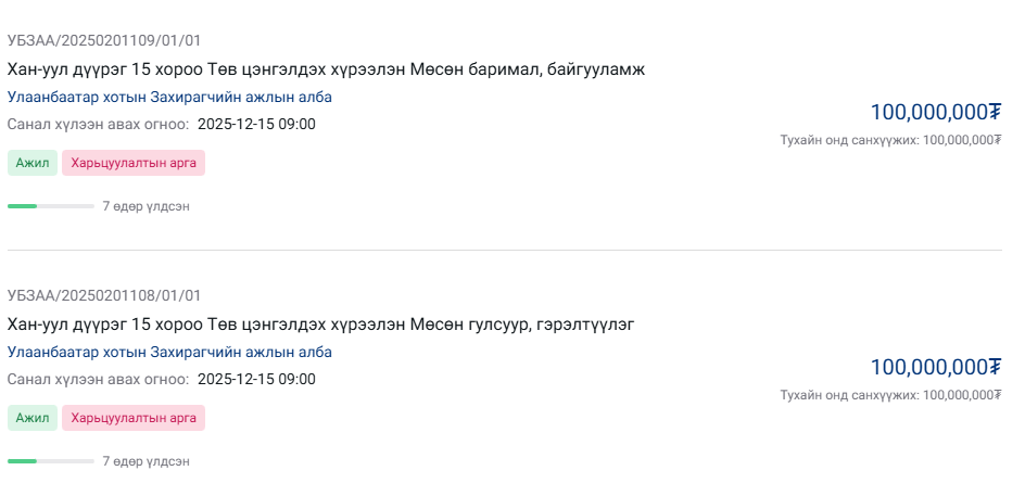 | УЛААНБААТАР ХОТЫН ЗАХИРАГЧИЙН АЖЛЫН АЛБАНЫ ДАРГА Г.БАТЗОРИГ 32-ЫН ТОЙРОГТ 200 САЯ ТӨГРӨГӨӨР МӨСӨН ГУЛГУУР, БАРИМАЛ ХИЙХ ТЕНДЕР ЗАРЛАЖЭЭ |