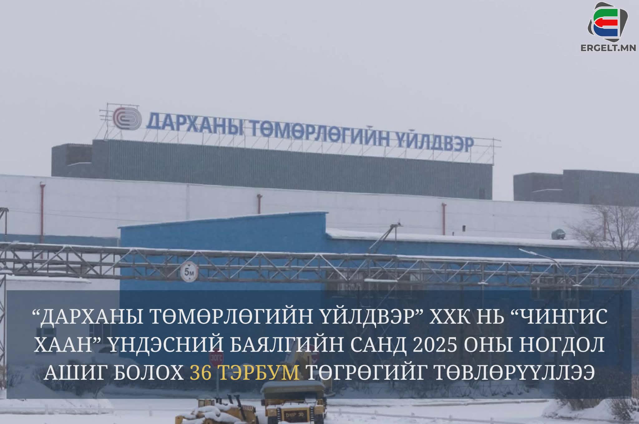 “ДАРХАНЫ ТӨМӨРЛӨГИЙН ҮЙЛДВЭР” ХХК НЬ “ЧИНГИС ХААН” ҮНДЭСНИЙ БАЯЛГИЙН САНД 2025 ОНЫ НОГДОЛ АШИГ БОЛОХ 36 ТЭРБУМ ТӨГРӨГИЙГ ТӨВЛӨРҮҮЛЛЭЭ.