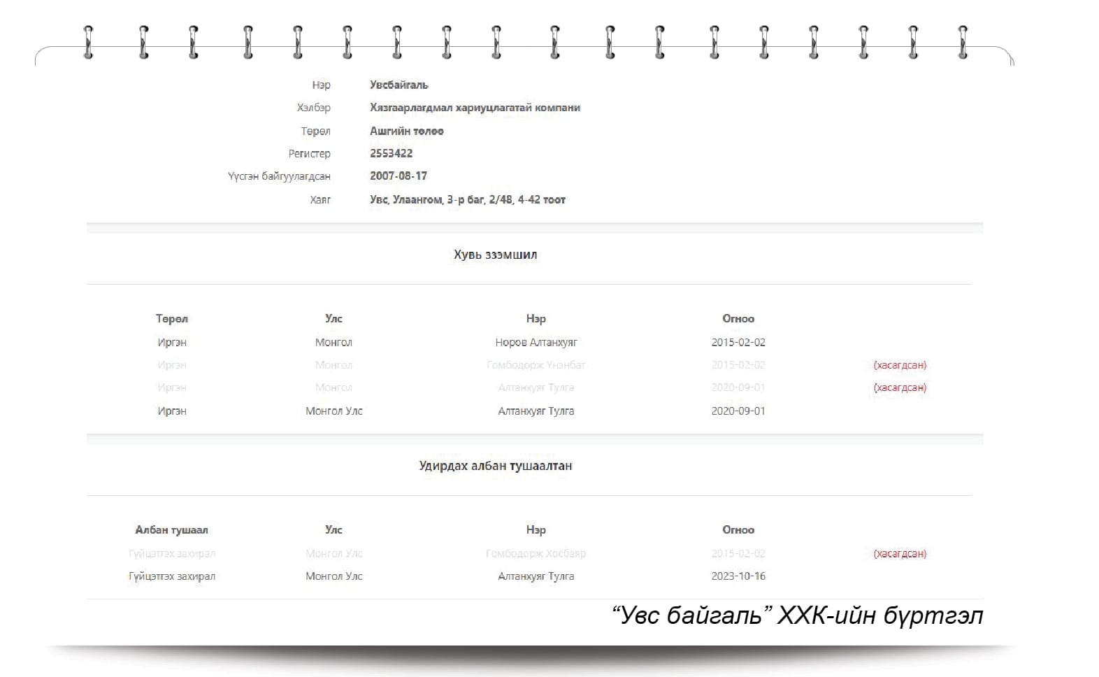 Нэрлэбэл, УИХ-ын гишүүн Н.Алтанхуяг “Увс байгаль” ХХК, “Хаан жимс Эс Би Ти” ХХК, “Монголын чацаргана тариалагч үйлдвэрлэгчдийн үндэсний холбоо” ТББ, “Мах экспорт” ХХК-уудад хувь эзэмшдэг. “Мах экспорт” ХХК-ийг Багабиндэрийн Бат-Энэрэл, Дашхүүгийн Гэрэлхүү нартай хамтран эзэмшдэг. Судалж үзвэл, Дашхүүгийн Гэрэлхүү нь Н.Алтанхуягийн төрсөн дүү Н.Наранцэцэгийн нөхөр, харин Багабиндэрийн Бат-Энэрэлийн хувьд Н.Алтанхуягийн “Мах экспорт” ХХК-аас өөр компанид хувьцаа эзэмшдэггүй, бизнесийн түүхгүй нэгэн ажээ. Сонирхолтой нь, Улсын Ерөнхий прокурор асан М.Энх-Амгалангийн төрсөн эгч М.Оюунчимэгийнх нь хүүг Багабиндэрийн Бат-Энэрэл гэдэг. Н.Алтанхуягийн эхнэр Х.Сэлэнгэ нь “Бьюмонд скин партнерс” ХХК болон “Монголын ирээдүй эрүүл хүүхэд” ТББ, “Тамирротари клуб” ТББ-ийг эзэмшдэг. Хүү А.Тулга нь “Арвайн даллага” ХХК, “Увс байгаль” ХХК, “Хаанжимст Эс Би Ти” ХХК, “Эмнэлгийн техник” ХХК-уудыг аав Н.Алтанхуяг болон аавынхаа ах, дүү нартай хамтран эзэмшиж, гүйцэтгэх захирлаар нь ажилладаг. Харин А.Тулгын эхнэр Г.Ундрал нь “Коала” гэх ХХК-ийг эзэмшдэг. Өмнө нь энэ компанийг Н.Алтанхуягийн ах Н.Баттогтох, дүү Н.Наранцэцэг, Б.Цог-Очир нар эзэмшдэг байсан. Н.Алтанхуягийн том охин А.Наранмандахын нэр дээр компани бүртгэлгүй ч түүний нөхөр М.Алтанцог нь “Амуу тариа сор”, “САНУГ” ХХК-уудыг эзэмшдэг.