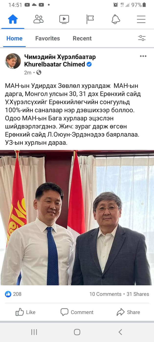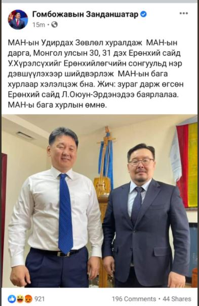 Сангийн сайд Ч.Хүрэлбаатар У.Хүрэлсүхтэй хамт авахуулсан зургаа “Ерөнхий сайдаар дарууллаа” хэмээн сайрхан бичээд удаагүй байхад УИХ-ын дарга Г.Занданшатар яг ижилхэн агуулгатай тайлбар бичээд цахим орчинд зургаа нийтэлжээ. Үүнийг нь харсан цахим хэрэглэгчид “Манай ерөнхий сайд муугүй зурагчин юм байна” хэмээн ёжилж байгаа харагдана. Нээрээ л намынхаа томчуудын зургийг залуухан Ерөнхий сайд нэлээд хичээж дарсан болов уу гэмээр зургийн гэрэл, сүүдэр, фокусыг нь таруулаад хэрэндээ сайн авчээ.