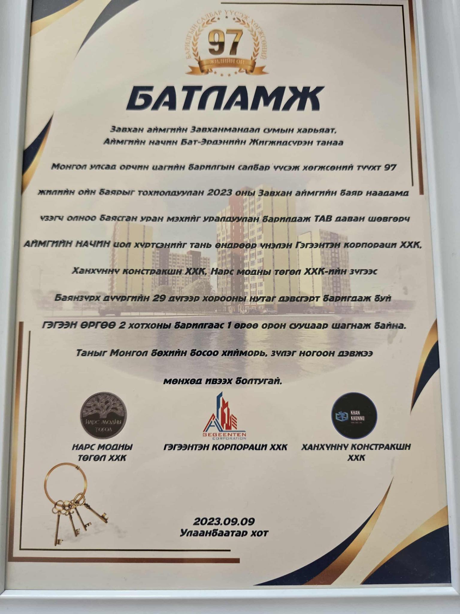 Залуу начингийн энэхүү амжилт, цолыг нь мялаан Анхбаатар захиралтай “Гэгээнтэн корпораци” ХХК-ийн Монхооны Очиржанцан захирал, “Хан Хүннү констракшн” ХХК-ийн Бүрэнжаргал захиралтай “Нарс модны төгөл” ХХК-ийн зүгээс Баянзүрх дүүргийн 29-р хорооны нутаг дэвсгэрт баригдаж буй “Гэгээн-Өргөө-2” хотхоны барилгаас нэг өрөө орон сууцаар урамшуулжээ.