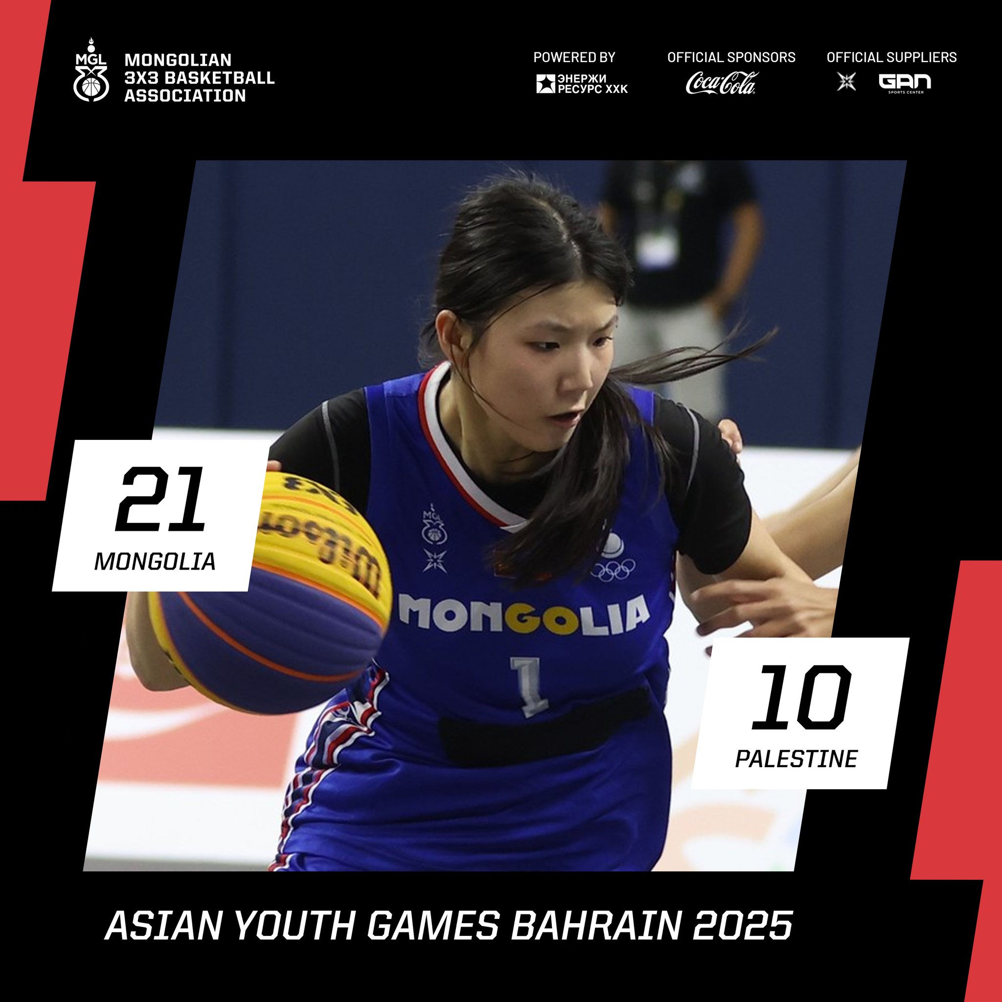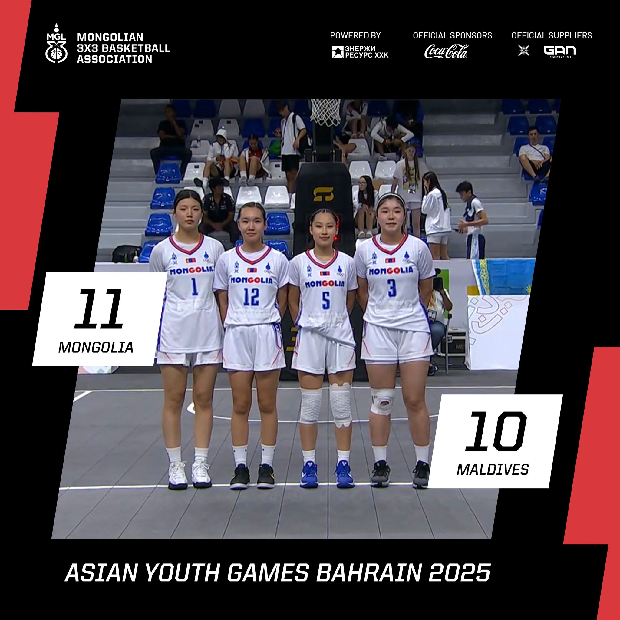 Монгол Улсын 3x3 сагсан бөмбөгийн өсвөрийн эмэгтэй шигшээ баг Азийн хүүхдийн III наадмын хэсгийн тав дахь тоглолтод Мальдив Улсын шигшээ багийг 11:10-аар хожиж тэмцээний эхний хожлоо авсан.