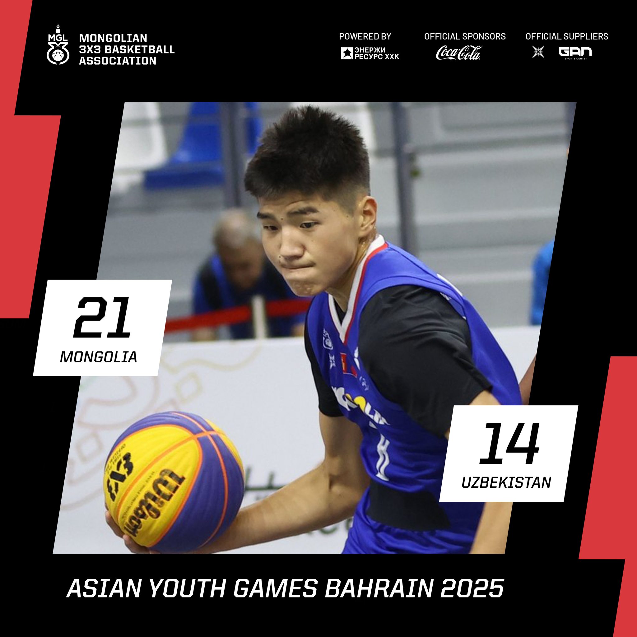 Бахрейн Улсын Манама хотод өсвөр үе, залуучуудын наадам үргэлжилж байна. Өнөөдөр Монгол Улсын 3x3-ын сагсан бөмбөгийн өсвөр үеийн эрэгтэй шигшээ баг Азийн хүүхдийн III наадмын шөвгийн наймын тоглолтыг Узбекистан Улсын шигшээ багтай хийв. Тус тоглолтод манай баг, Узбекистаны багийг 21:14-өөр хожиж тэмцээний хагас шигшээд шалгарлаа. Монгол Улсын өсвөрийн эрэгтэй шигшээ баг БНХАУ болон Иран Улсын шигшээ багуудын хожсонтой нь хагас шигшээд тоглоно.