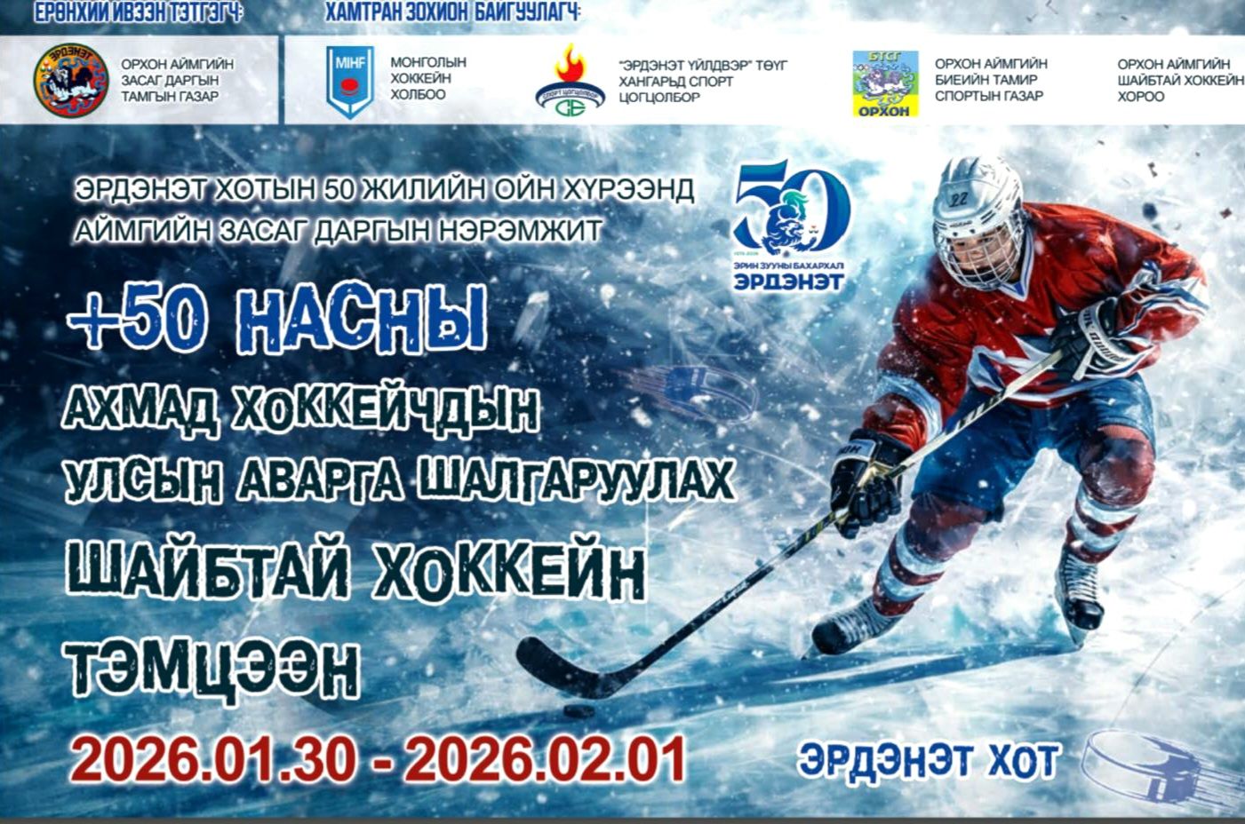 Орхон аймгийн Эрдэнэт хотын 50 жилийн ойн хүрээнд Орхон аймгийн Засаг даргын нэрэмжит “Мастерс” ангиллын хоккейн улсын аварга шалгаруулах 50 насны тамирчдын тэмцээн өнөөдөр эхэлнэ. Тус УАШТ нэгдүгээр сарын 30 өдөр Эрдэнэт хотын Орос сургуулийн мөсөн талбайд эхлэхэд бэлэн боллоо. Тэмцээний ерөнхий ивээн тэтгэгч Орхон аймгийн засаг даргын тамгын газар,