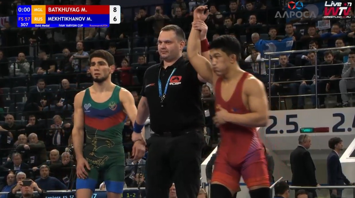 ОХУ-ын Красноярск хотод олимп, дэлхийн аварга, алдар бөх Иван Ярыгины нэрэмжит чөлөөт бөхийн “Алтан Гран при-2026” тэмцээн үргэлжилж байна. Тус тэмцээний эрэгтэйчүүдийн 57 кг-ын жинд Үндэсний шигшээ баг, “Төгс” дэвжээний бөх, Азийн аваргын хүрэл медальт, ОУХМ Батхуягийн Мөнх-Эрдэнэ амжилттай барилдаж алтан медаль хүртлээ.