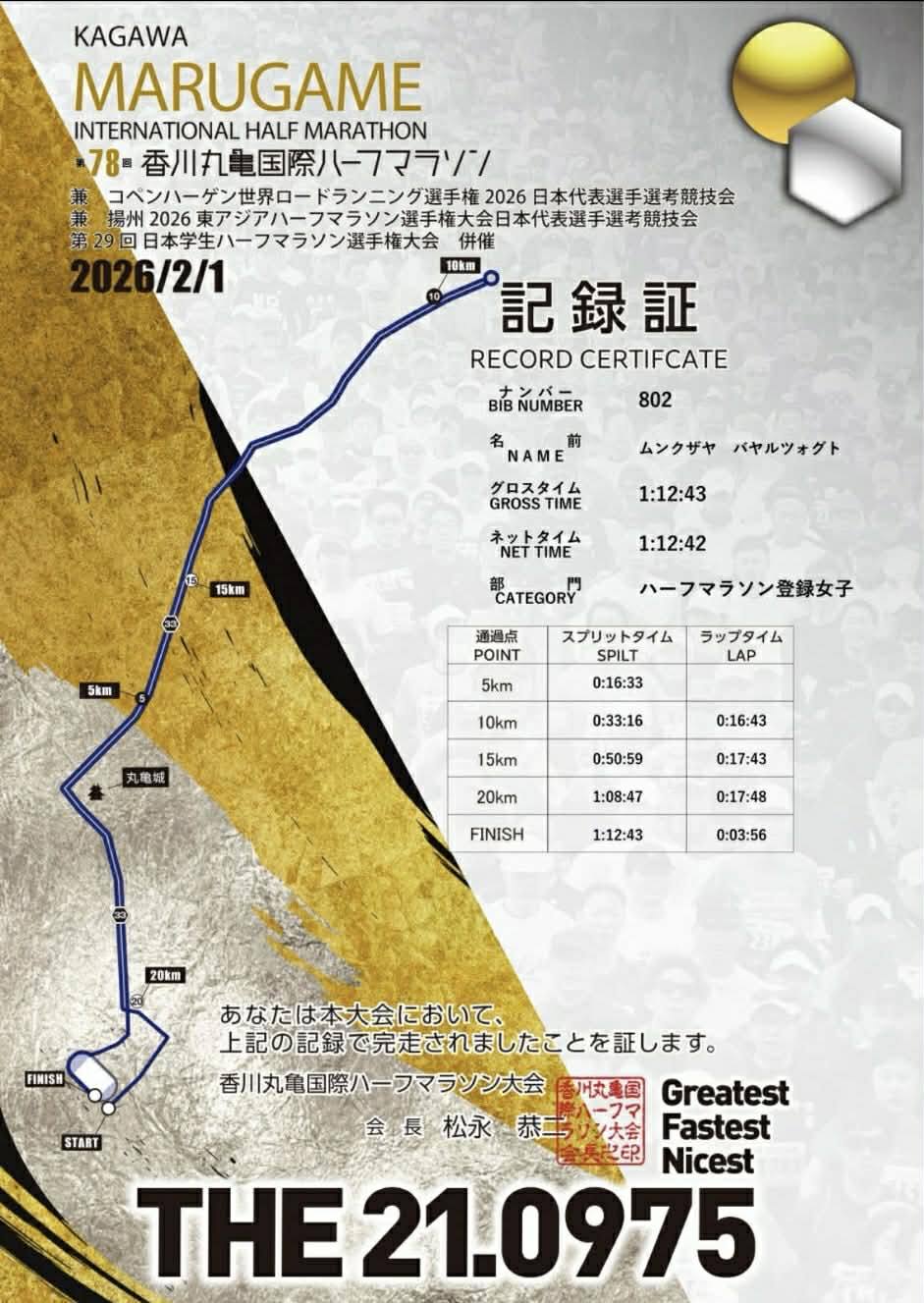 Япон Улсын Маругами хотод 78 дахь удаагийн Кагава маругами олон улсын хагас марафон гүйлтийн тэмцээн 2026 оны хоёрдугаар сарын 1-ний өдөр боллоо. Тус марафонд Хөнгөн атлетикийн Үндэсний шигшээ багийн тамирчин Д. Гантулга 1:02:42 цагийн амжилтаар “PB”, “SB” амжилтаа ахиулсан байна. ОУХМ Б. Мөнхзаяа 1:12:43 цагийн амжилтаар “PB”, “SB” хийж гүйллээ.