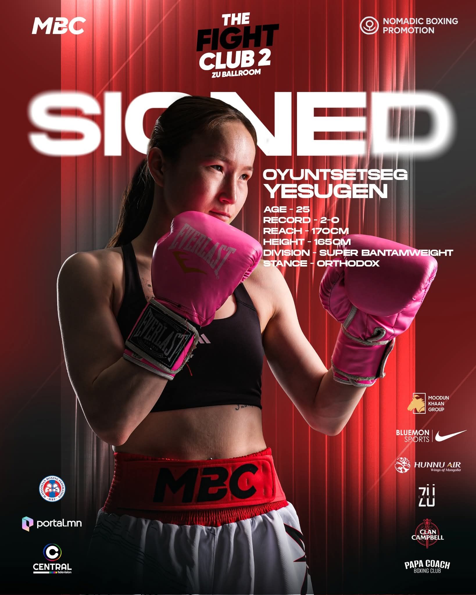 Монгол Улсын мэргэжлийн боксчдын чансаа тогтоох "The Fight Club-2" эвентэд тулалдахаар Оюунцэцэгийн Есүгэн гэрээ байгууллаа. Боксын үндэсний шигшээ багийн тамирчин О.Есүгэн нь “Super bantamweight” буюу 55.3 кг-ын жинд тулалдана.