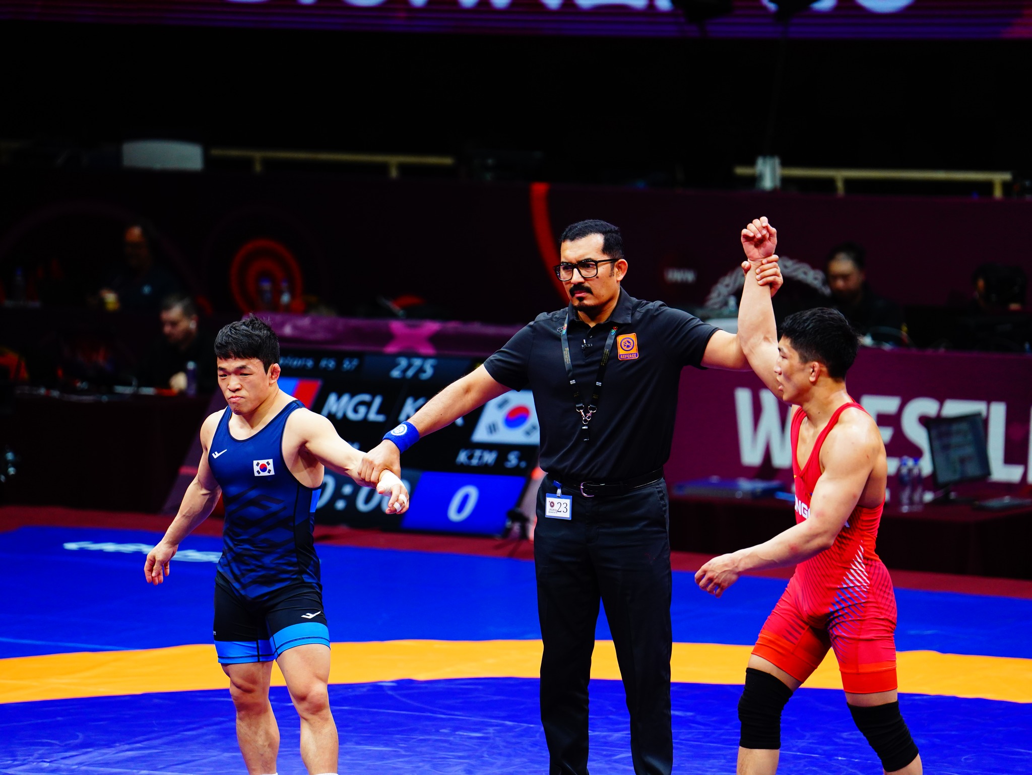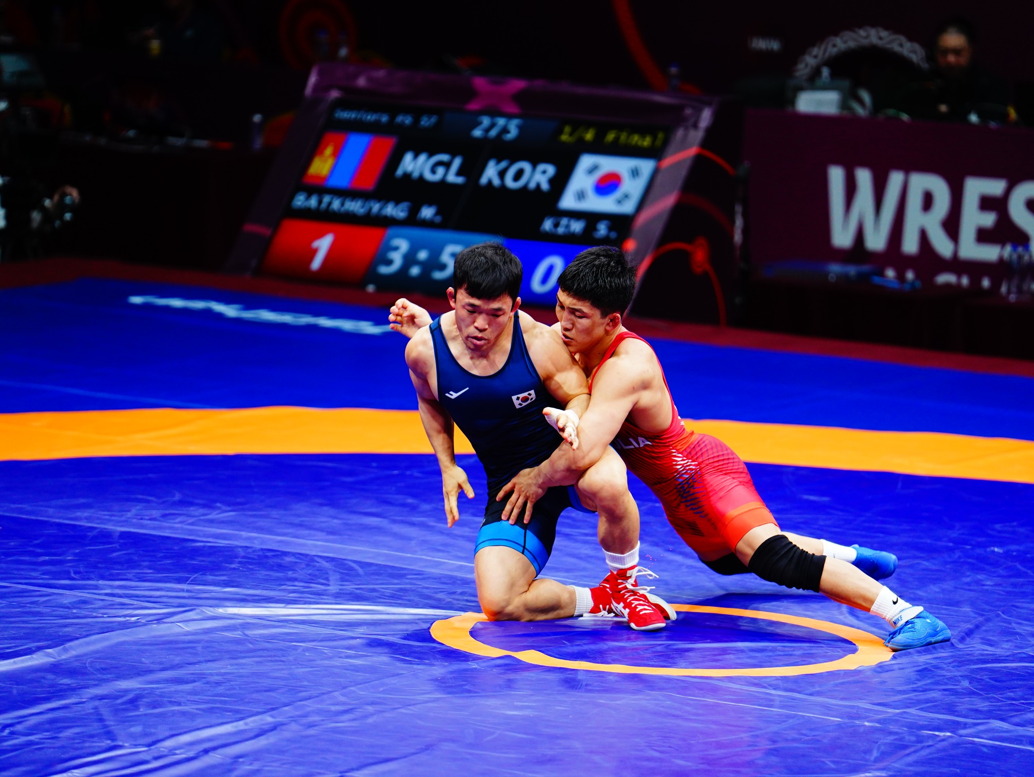Тэрбээр Өмнөд Солонгосын Ким Сон Гвоныг илүүрхэн ялснаар хөнгөн жингийн хагас шигшээд шалгараад байна. Б.Мөнх-Эрдэнэ орой Тажикистан болон Киргизстаны бөхчүүдийн хэн ялсантай нь барилдана.
