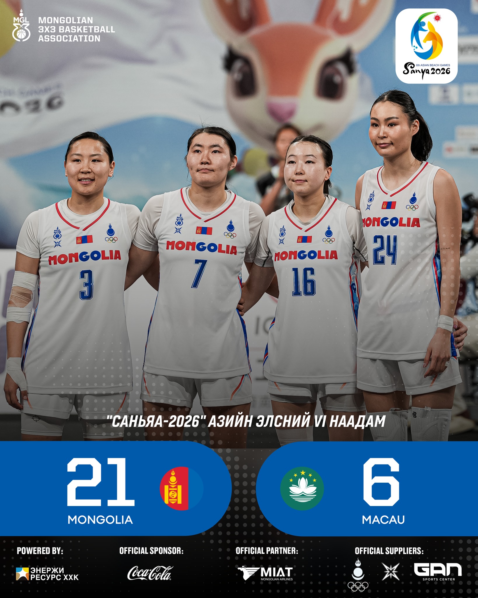 Хятад Улсад "САНЬЯА-2026" Азийн элсний VI наадам үргэлжилж байна. Монгол улсын 3х3 сагсан бөмбөгийн эмэгтэй шигшээ баг Макаогийн шигшээ багийг21:6-гаар хожиж тэмцээний шилдэг наймд шалгарч үлдлээ.