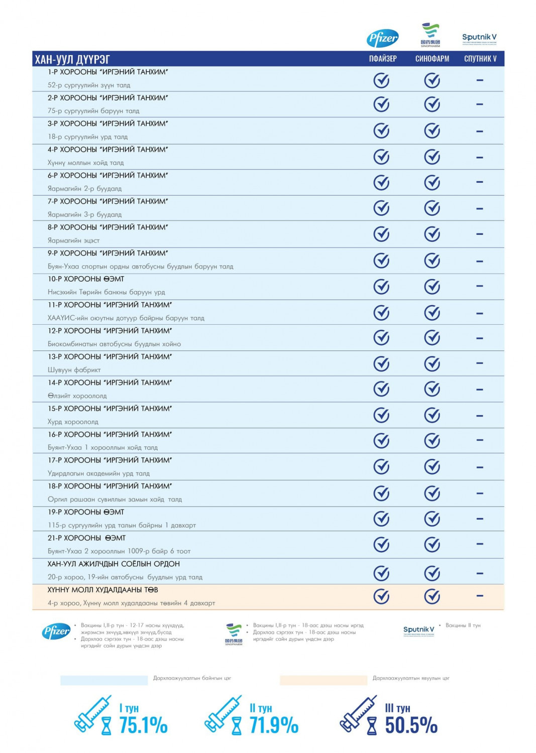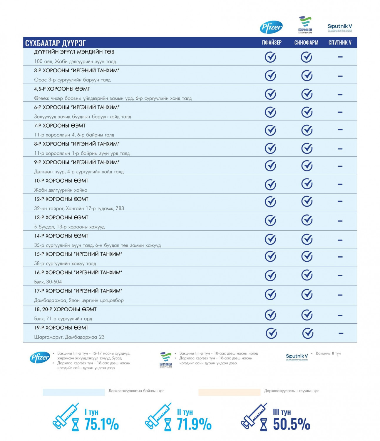 Нийслэлд өнөөдөр суурин 159, түр хоёр цэгт 161 багийн 752 эмч, ажилтан ажиллаж 8700 иргэнийг дархлаажуулахаар төлөвлөжээ. Өнөөдөр ажиллах дархлаажуулалтын цэгийг танилцуулж байна.