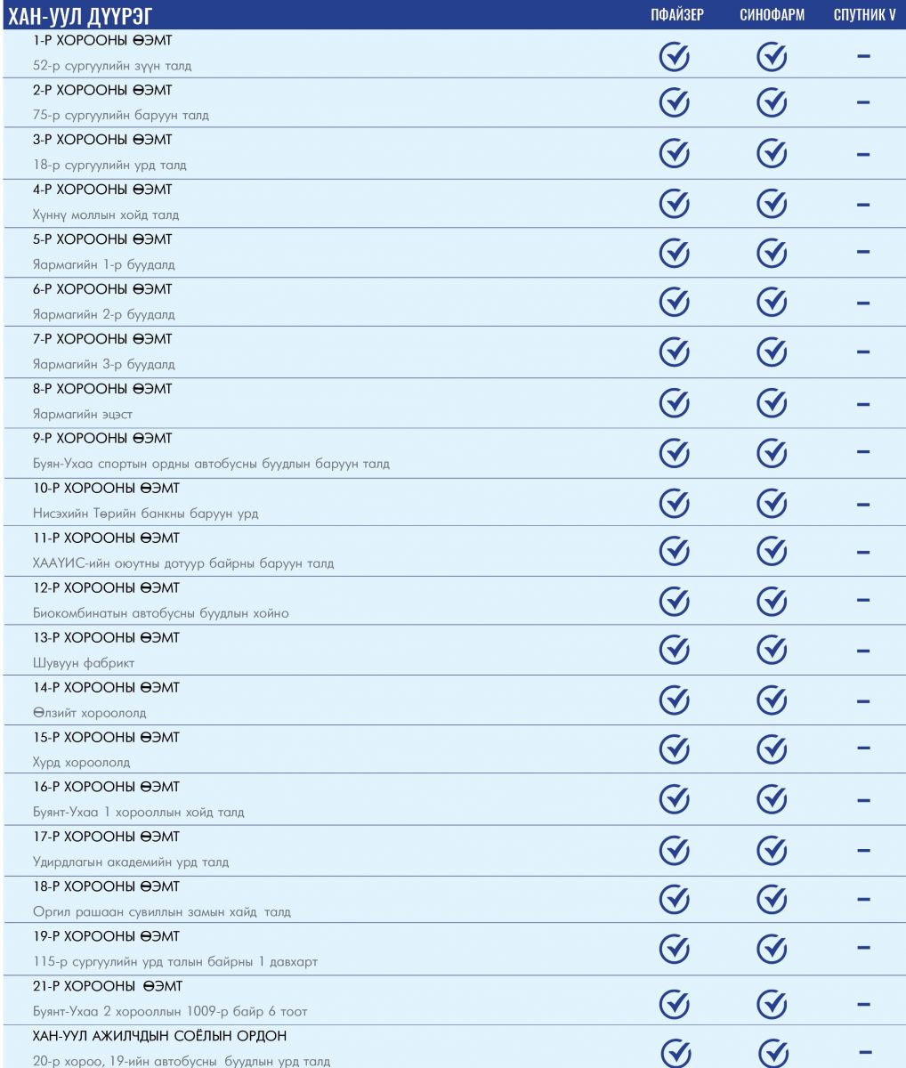 Гуравдугаар сарын 1-нд буюу өнөөдөр ажиллах дархлаажуулалтын цэгүүд. Та өөрт ойр вакцины аль ч цэгт очиж дархлаажуулалтад хамрагдах боломжтой. Дархлаажуулалтын цэгүүд 09:00-17:30 цаг хүртэл ажиллана.