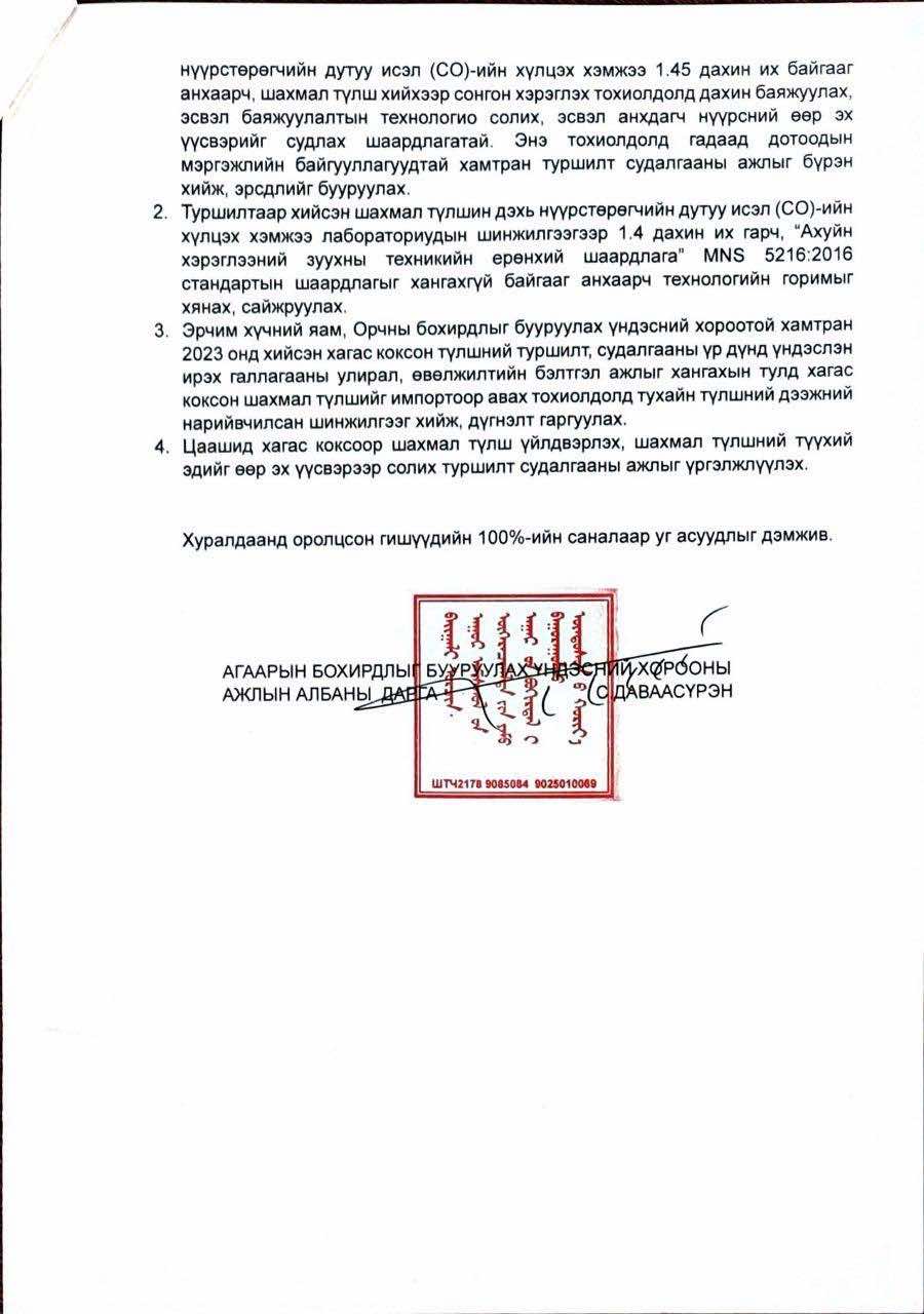 Засгийн газрын 2024 оны 22 дугаар тэмдэглэл болон 2025 оны хоёрдугаар тэмдэглэлээр сайжруулсан шахмал түлшний туршилтын ажлыг итгэмжлэгдсэн лабораториудын буюу TTRC, ALS, Ашигт малтмал газрын тосны газар, нийслэлийн Агаар, орчны бохирдолтой тэмцэх газрын лабораторийн шинжилгээнд хүргүүлсэн. Шинжилгээгээр баяжуулсан нүүрсээр хийсэн шахмал түлшний хаягдал утаанд хүхэрлэг хий, угаарын хийн агуулга MNS5216:2016 стандартын шаардлагыг хангаагүй. Тиймээс Агаарын бохирдлыг бууруулах Үндэсний хорооны дэргэдэх Эрдэмтдийн зөвлөлөөс шахмал түлш үйлдвэрлэлд ашиглах тохиолдолд дахин баяжуулах, баяжуулалтын технологийг өөрчлөх эсвэл анхдагч нүүрсний өөр эх үүсвэрийг судлах шаардлагатай гэж үзэж АББҮХ-ны тогтоолоор ирэх галлагааны улиралд импортын бэлэн түлш оруулж ирэх шийдвэр гарсан.