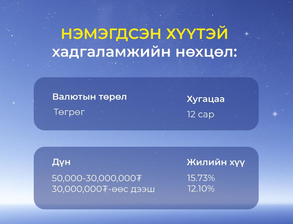TIP: Таны шинээр нээсэн хадгаламжийн дүнгийн 50,000₮ тутамд “Хадгаламжтай аялал” аяны 1ш сугалаа автоматаар олгоно. Харин та сугалаагаараа Ази тивээр хосоороо аялах 30 азтаны нэг болох боломжтой. “Хадгаламжтай аялал” аяны дэлгэрэнгүй нөхцлийг ЭНД дарж уншина уу.