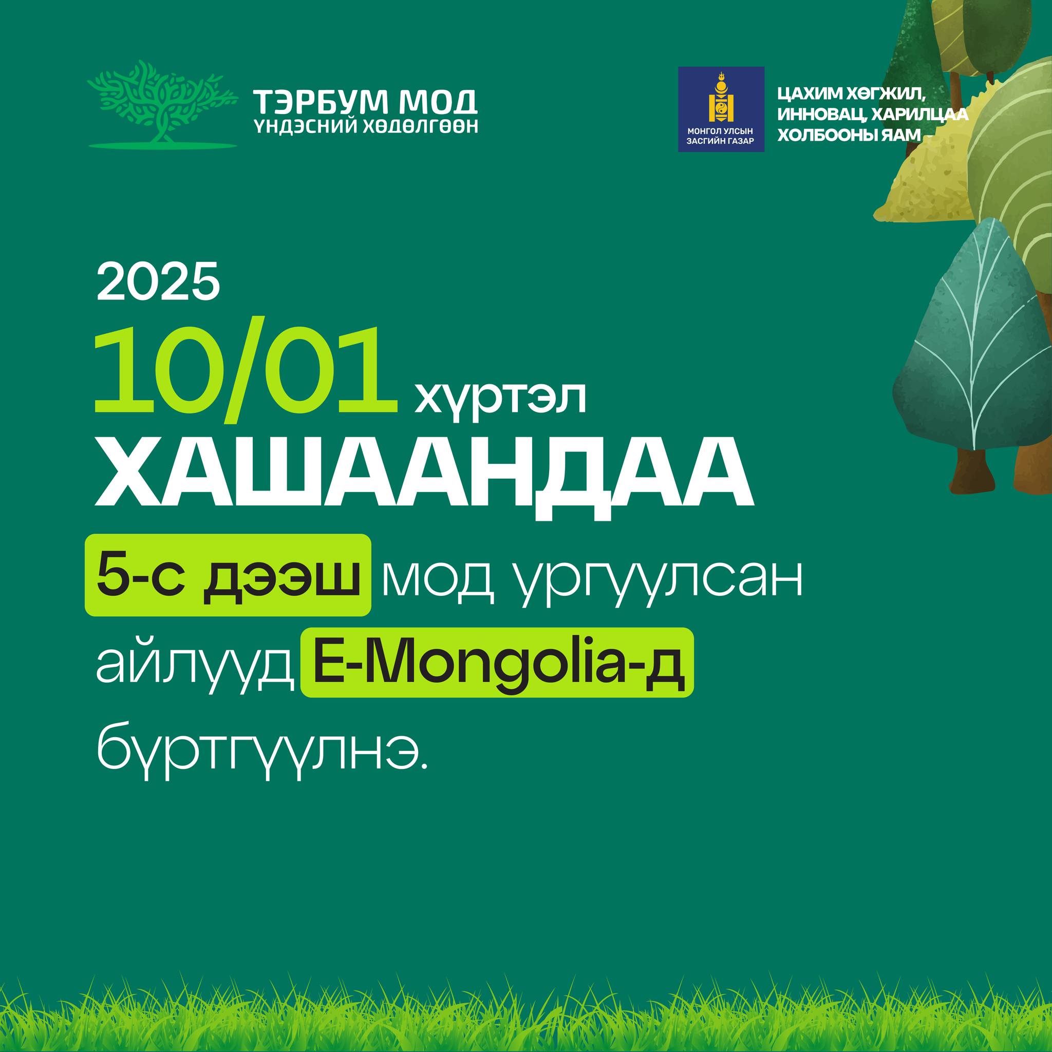 Иргэд хашаандаа тарьж, ургуулсан модоо “e-mongolia” гар утасны аппликейшнээр 10 дугаар сарын 1 хүртэл бүртгүүлэх юм.
