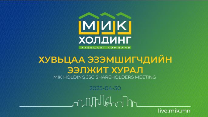“МИК Холдинг” ХК-ийн Төлөөлөн удирдах зөвлөлийн 2025 оны 03 дугаар сарын 18-ны өдрийн 25/06 дугаартай тогтоолын дагуу компанийн Хувьцаа эзэмшигчдийн ээлжит хурал 2025 оны 4 дүгээр сарын 30-ны өдрийн 11:00 цагт компанийн өөрийн боловсруулан программыг ашиглан live.mik.mn хаягаар дамжуулан цахимаар хуралдлаа. Тус хуралд нийт саналын эрхтэй хувьцаа эзэмшигчдээс 97.65 хувийн ирцтэй оролцлоо. Хурлаар дараах асуудлыг тус тус хэлэлцэн баталлаа. Үүнд:
