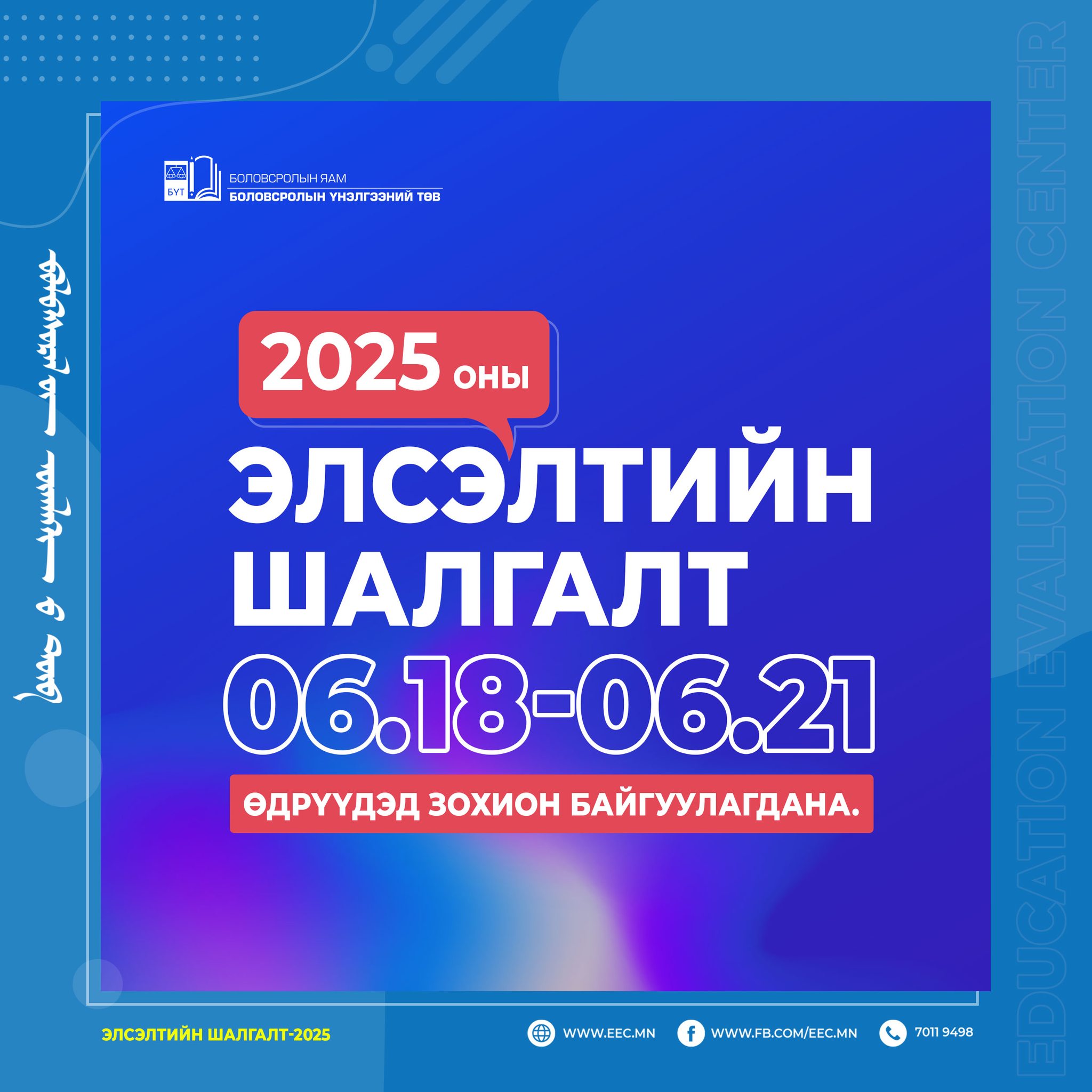 2025 оны Элсэлтийн шалгалт 06 дугаар сарын 18-наас 06 дугаар сарын 21-ний өдрүүдэд зохион байгуулагдана.
