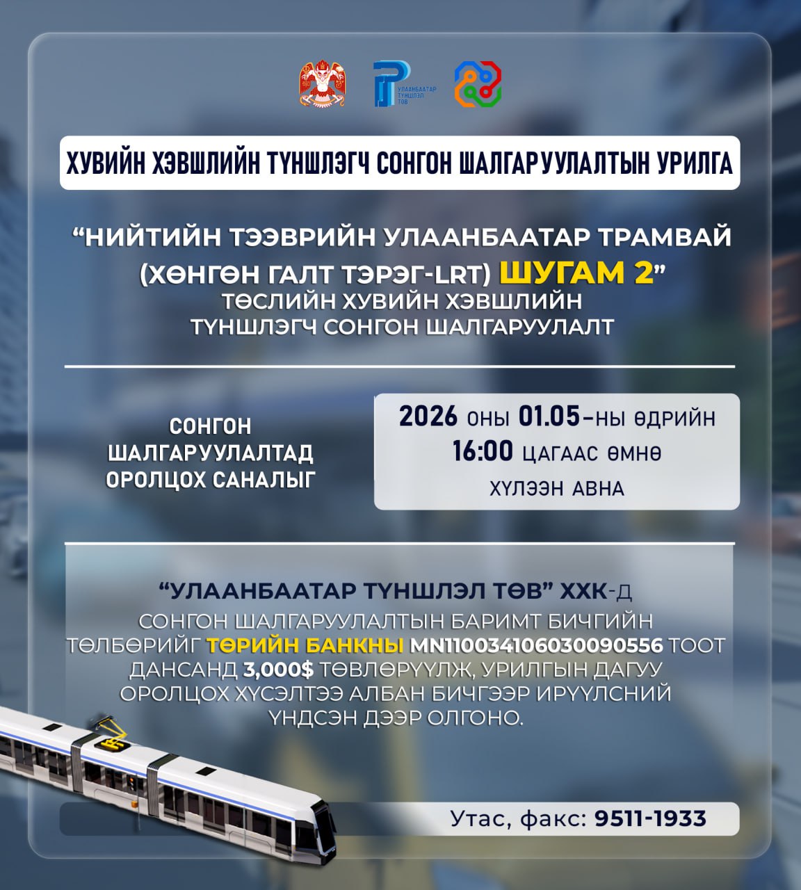 “Нийтийн тээврийн Улаанбаатар Трамвай шугам-1” төслийн хувийн хэвшлийн түншлэгчийг сонгон шалгаруулалтад урьж байна