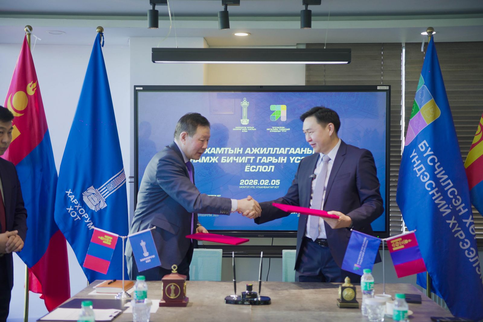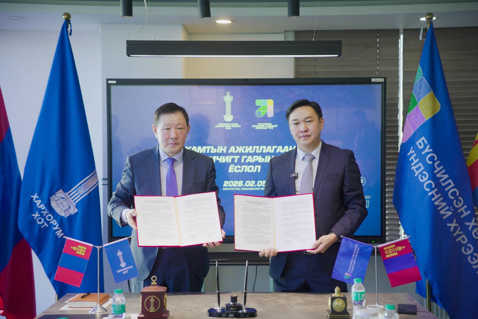 Бүсчилсэн хөгжлийн бодлогыг хэрэгжүүлэх, Хархорум хотыг байгуулах зорилтын хүрээнд Орхоны хөндийд нийслэлийн баримжаатай Хархорум хотыг байгуулахтай холбоотой бодлого, төлөвлөлт, судалгаа шинжилгээ, төсөл хөтөлбөрүүдийг харилцан уялдуулан хэрэгжүүлэхээр Бүсчилсэн хөгжлийн үндэсний хүрээлэнгийн Гүйцэтгэх захирал доктор, дэд профессор Д.Эрдэнэбаяр, Хархорум хотын Захирагч Л.Халтар нар хамтын ажиллагааны САНАМЖ БИЧИГТ гарын үсэг зурлаа.