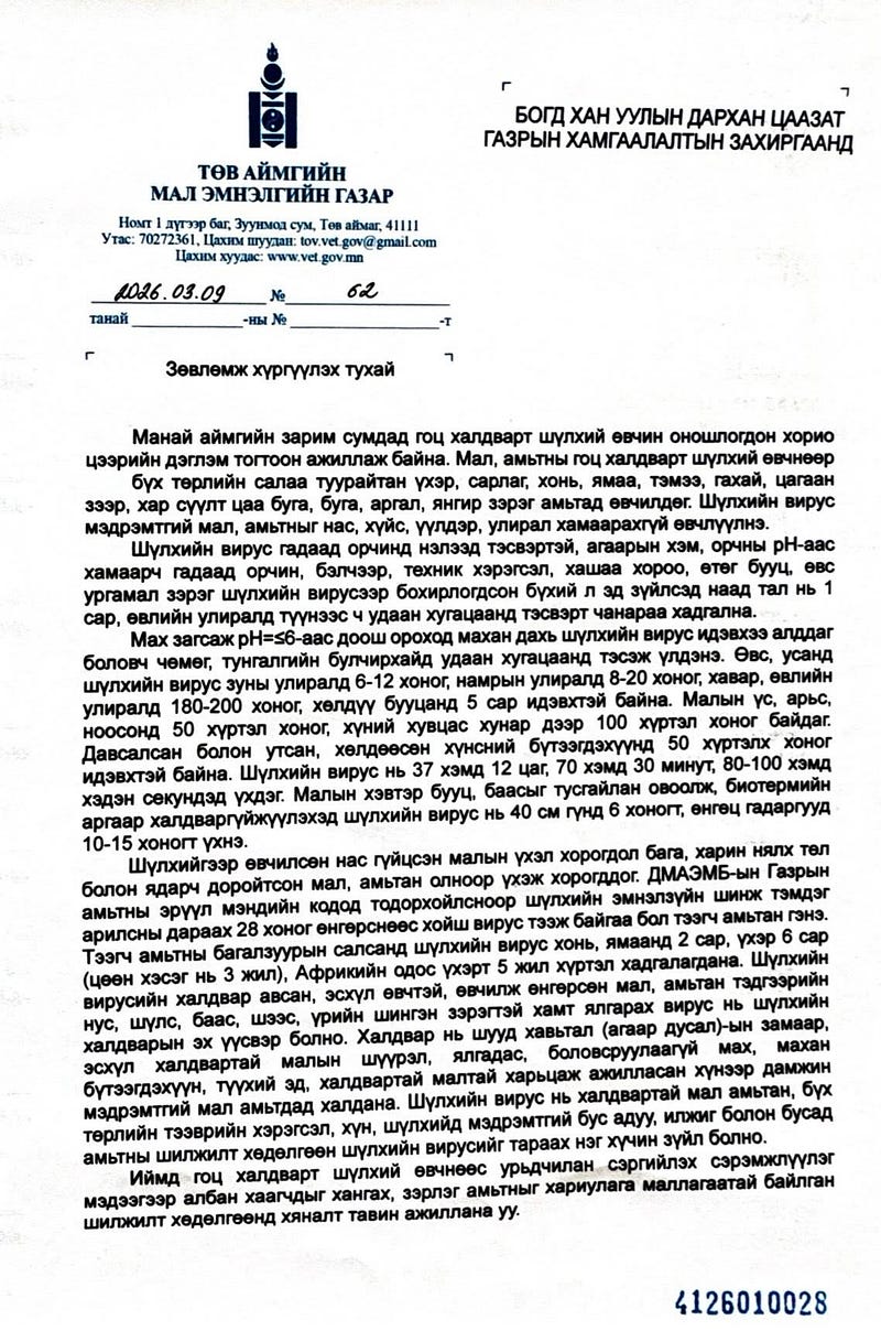 | Төв аймгийн зарим суманд малын шүлхий өвчин гарчээ |
