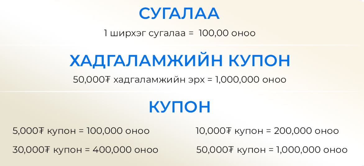 Оноогоо ашиглан сугалаа авсан мерчантуудаас сар бүр 3 азтан шалгаруулах бөгөөд аяны хугацаанд нийт 10 азтан Iphone-17 гар утас, 20 азтан 1,000,000₮-ийн хадгаламжийн эрх, 1 азтан супер шагнал 2 өрөө байрны эзэн болох болно.