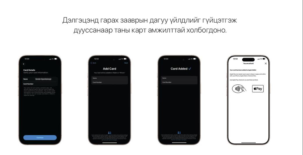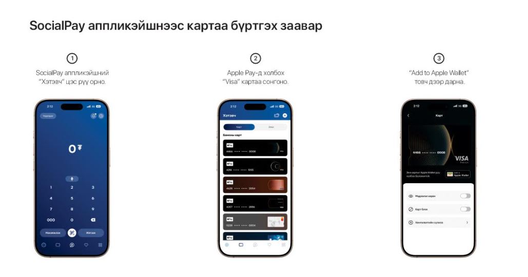 Харин картаа захиалсны дараа SocialPay аппликэйшнээр дамжуулан Apple Pay-д картаа холбох юм.