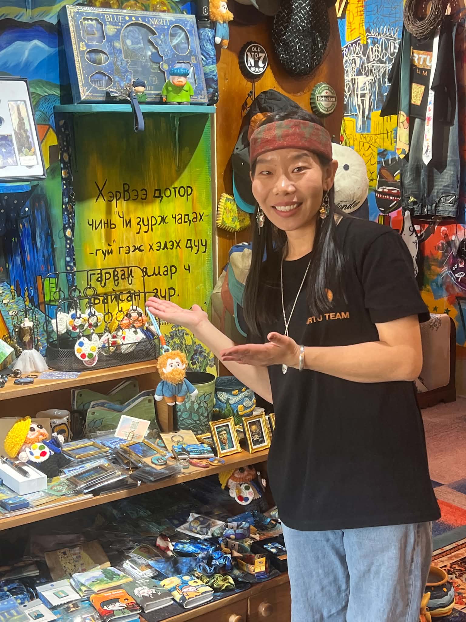 Ю.САРДААНА: Манайх дэлгүүр урлаглаг байлгах гэж зорьсон. Ван гок тэргүүтэй уран зураачдын бүтээлийн бэлэг дурсгал, уран зурагтай наадаг зураг, оймс, бээлий, алчуур, хувцасыг худалдаалж байна. Мөн төрөл бүрийн чамин дурсгалын зүйл, аяга байгаа. Манайхаар үйлчлүүлсэн хүмүүс сайхан мэдрэмж, сэтгэлийн таашаал аваад гараасай гэж хүсдэг. Бид бэлэн бүтээгдэхүүнээс гадна түлхүүрийн оосор дээр өөрсдийн гараар хүссэн зургийг нь зурж өгдөг. Мөн “Арту” урлангийн суралцагч нар маань нэхмэл бүтээлүүд хийдэг. Үүнийгээ цаашдаа илүү хөгжүүлээд явна. Манай урлангийн суралцагч нарын бүтээлүүд хананд өлгөэтэй байгаа. Урлан бүх насны хүмүүст нээлттэй хичээлдэг. Уг урлангийн багш, суралцагч нар хамтран “Арту” кофе шопыг нээсэн. Тиймээс манайх илүү амьд мэдрэмжээр дүүрэн байгаа байх. Манайд орж ирж байгаа хүмүүс “Хөөх ямар гоё диваажин шиг юм бэ. Яасан сэтгэлээсээ тохижуулаа вэ. Ийм газар ховор шүү” гэж ихэвчлэн хэлдэг. Тэгээд бүтээл, бүтээгдэхүүнтэй танилцаад, худалдан авалтаа хийгээд гардаг. Мөн кофегоо хүлээх зуураа сонирхдог. Өдөр бүр хүмүүсээс гоё үг сонсож, жаргаж ажиллаж байгаадаа баяртай байдаг.