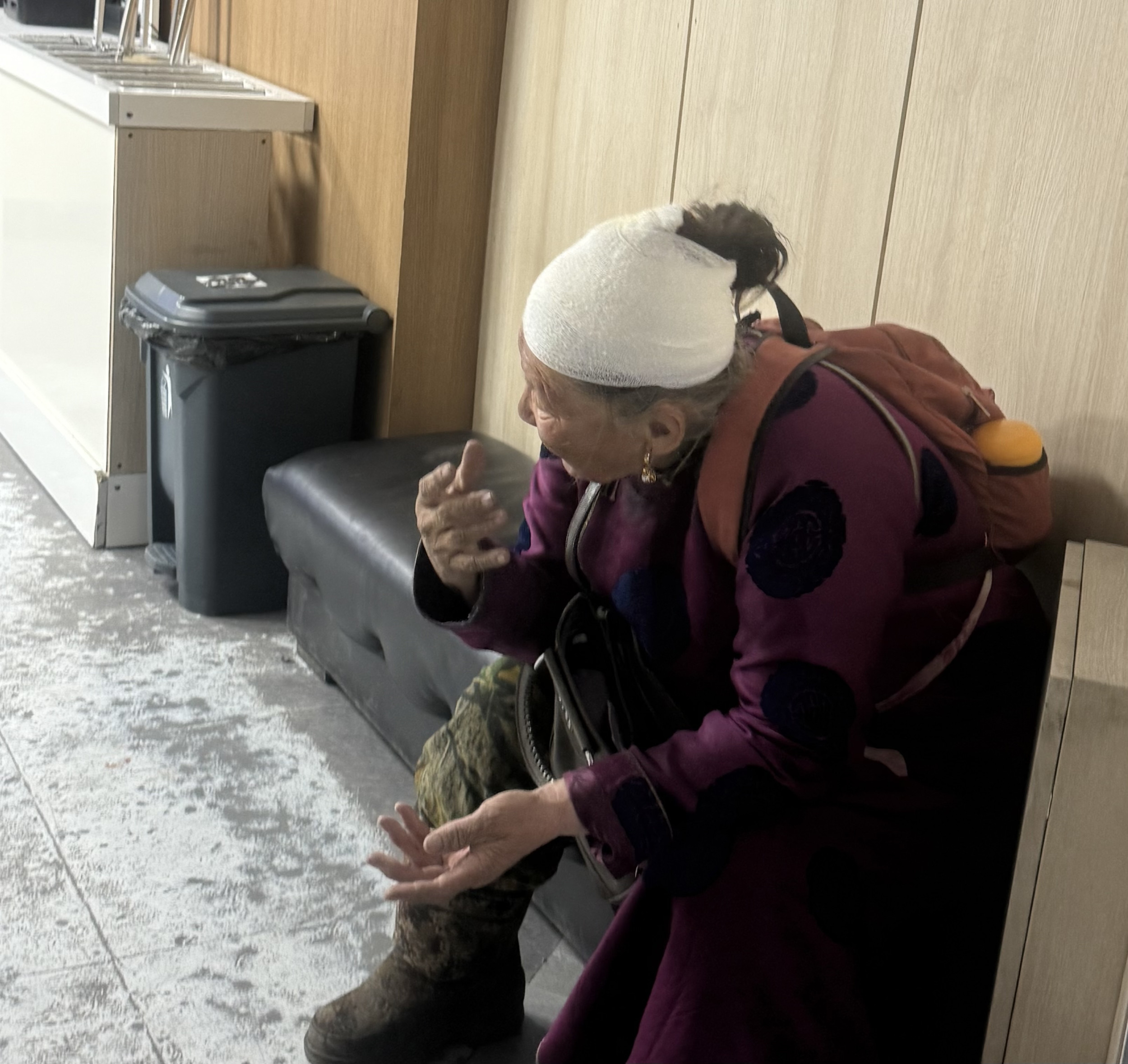 Эмнэлгийн коридороор орь дуу тавих хүмүүстэй зэрэгцээд 70 орчим настай болов уу гэмээр толгойгоо цагаан бинтээр ороочихсон согтуу эмгэн хоолныхоо чадлаар “Миний гурван хайрцагтай юм хайчихваа, хулгайчуудаа” хэмээн орилж гарлаа. Үйлчлэгч бололтой цэнхэр хувцастай эмэгтэй “Та чимээгүй байгаарай. Толгой чинь өвдөнө” гэхэд эмгэн улам бүр агсамнаж, орилж гарах нь тэр. Хажууд нь зогсож байсан цагдаа энэлгийн ажилтанд “Та болгоомжтой байгаарай. Уг нь бид хүүхдүүдийг нь дуудчихсан. Шар хад орчимоос ирсэн эмээ юм” хэмээн анхуурууллаа.