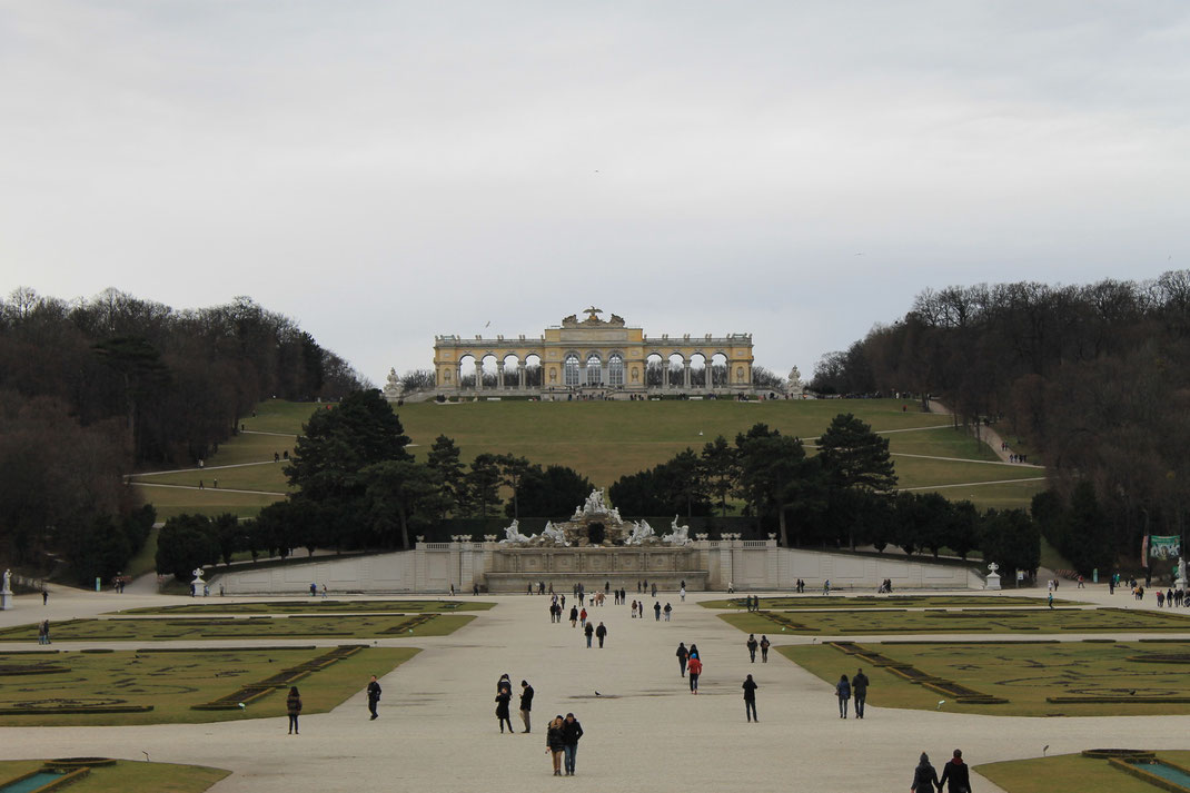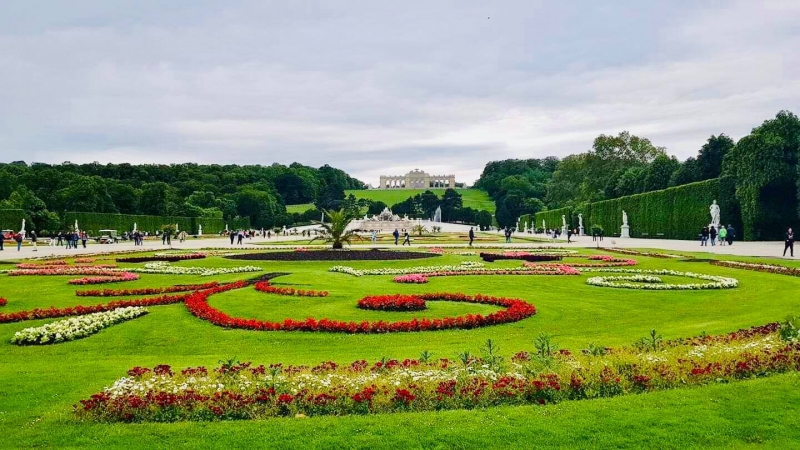 Шёнбрунн шилтгээний баруун талын хашаагаар дамжиж ордны урд талаас музей руу орно. Шилтгээний урд талын Глориет цэцэрлэг хүрээлэн үнэхээр гайхалт том талбайг эзлэх юм билээ. Усан оргилуур, уран баримлын донж хэлбэр орчин үнэхээр гайхалтай уусан зохицжээ. Цэцэрлэг хүрээлэнгийн мод, бутыг нэгэн жигд тэгшлэн зассан байлаа. Зүлэг нь ногоон, цэцгэн хээтэй хивс дэвссэн юм шиг гоё. Зүлгийг өнгө, өнгийн цэцэгсээр уран чамин гоё хээ, угалз гарган гоёсон байлаа.