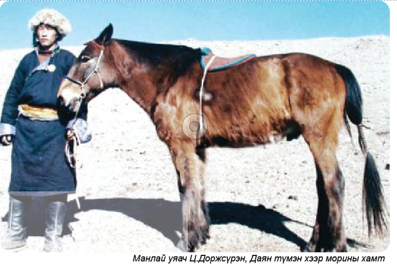 Манлай уяач Ц.Доржсүрэн гуай хээр морио уяна гэж ёстой хөглөнө. Хүмүүс наадам боллоо, уяа, засал гээд морио нүдний цөцгий мэт хайрлаж, бөөн юм болж байхад Ц.Доржсүрэн гуай хээр морио уначихаад хээв нэг айраг цагаа, тоглоом найр эргүүлээд явна. Харсан үзсэн хүн “Доржсүрэн энэ жил хээр морио уяагүй юм байна” гэж бодогдтол явдаг хэрнээ улсын баяр наадам болохоор хээр морь нь барианаас сум шиг шунгинан гараад, хол тасархай түрүүлж орж ирнэ. Бүр барианы зурхайд хурдан их морьд хүлээж зогссон хүмүүс “Энэ юун ганц адуу давхиж явна вэ. Уралдааны замаас нийлсэн булхайн адуу юу” гэтэл нь хамт уралдсан хурдан морьдоо хол хаяад, төрийн наадамд хоёр ч удаа магнайдаа тоосгүй түрүүлсэн энэ хурдан ажнай Партизаны сангийн аж ахуйн уяач Ц.Доржсүрэнгийн Даян түмэн хээр гэдгээрээ домог болсон тэнгэрийн хүлэг билээ.