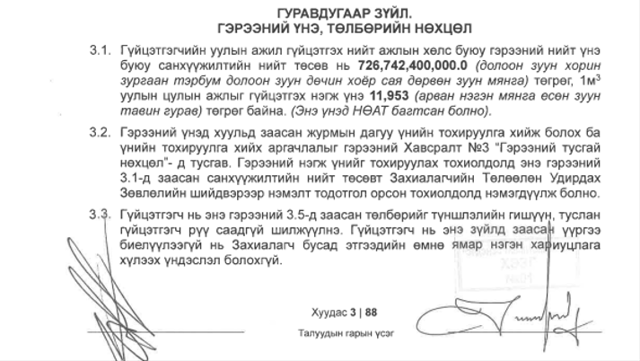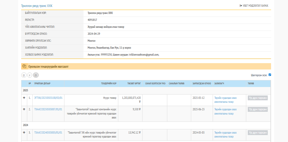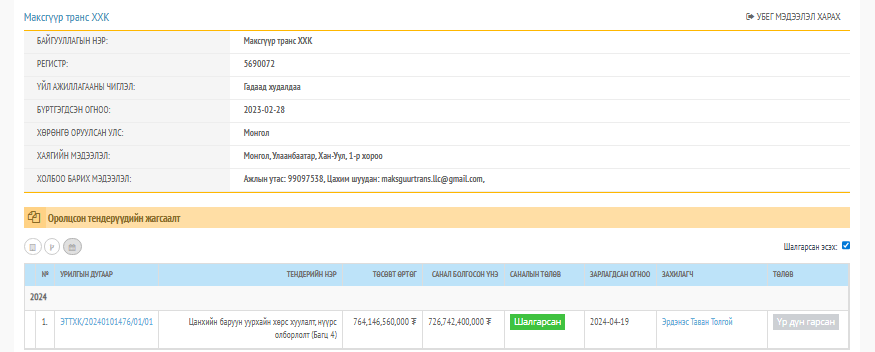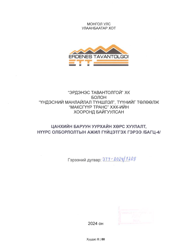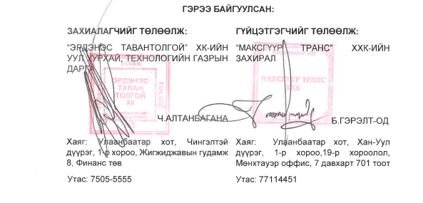 Баримт 1: 2024 оны тавдугаар сард “Эрдэнэс тавантолгой” ХК-ийн Цанхийн баруун уурхайн хөрс хуулалт, нүүрс олборлолтын хариуцах 764 тэрбум төгрөгийн тендерт “Максгүүр транс” ХХК шалгарч, зургадугаар сарын 10-нд “Эрдэнэс тавантолгой” ХК-ийн гүйцэтгэх захирлын үүрэг гүйцэтгэгч Х.Мөнхжаргалтай гурван жилийн гэрээ байгуулжээ. “Максгүүр транс” ХХК нь өмнө нь тендерт оролцож байсан түүхгүй, Төв аймгийн Заамарын уурхай, Дорнод аймгийн Хашаатын цавын уурхайд олборлолт хийж байсан гэхээс өөр мэдээлэлгүй компани байна.