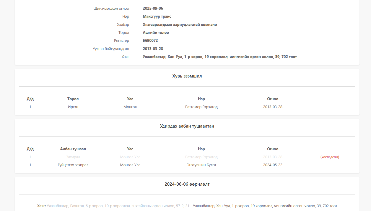 Баримт 4: Б.Гэрэлт-Одын “Максгүүр гранд” ХХК нь баз Г.Очирбаттайгаа хамтран эзэмшдэг “Ай Пи Эм Инвест” ХХК-ийн “Улаанбаатар хот, Баянгол дүүрэг, 6-р хороо, 10-р хороолол, 57-2, 31 тоот” хаяг дээр давхар бүртгэлтэй явж ирсэн. Гэтэл Б.Гэрэлт-од өнгөрөгч 2024 онд “Эрдэнэс тавантолгой” ХК-ийн 764 тэрбум төгрөгийн тендерт оролцож, гэрээ байгуулахынхаа өмнө “Максгүүр транс” ХХК-ийг хаягийг “Мөнх тауэр” оффис руу шилжүүлж өөрчилсөн. Өөрөөр бол, Г.Очирбаттай хамааралтай гэж харагдахгүй гэсэн заль гэж ойлгогдохоор байна.