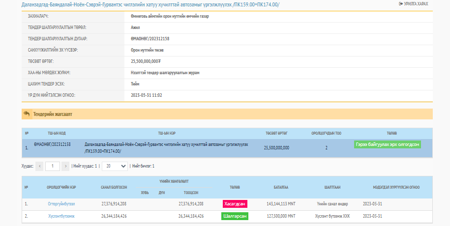 Өмнөговь аймгийн Даланзадгад-Баяндалай-Ноён-Сэврэй-Гурвантэс чиглэлийн хатуу хучилттай автозамын 25.5 тэрбум төгрөгийн тендер