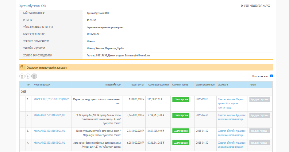 Харин энэ онд буюу 2025 оны тавдугаар сарын 21-нд Хөвсгөл аймгийн Мөрөн суманд зам тавих 12.6 тэрбум төгрөгийн гурван тендерт ганцаараа оролцоод, гурвууланд нь шалгарсан байна. Өөрөөр бол, “Хүслэнт бүтээмж” ХХК нь гурван тендерт өрсөлдөгчгүйгээр оролцоод, ганцхан өдрийн дотор 12.6 тэрбум төгрөгийн тендер “халаасласан” гэсэн үг.