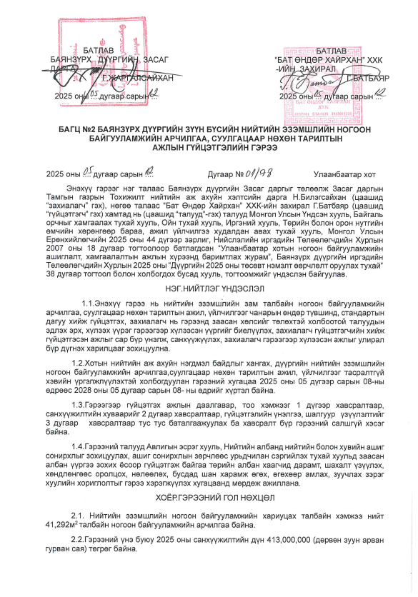БЗД-ийн зүүн бүс, Дүнжингарав орчмын ногоон байгууламжийг арчлах 413 сая төгрөгийн тендерт тус тус шалгарсан.