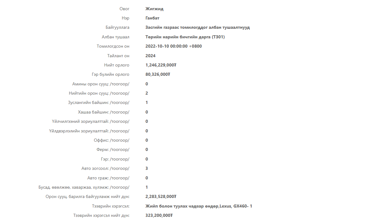 Тэр Сангийн яамны Төсвийн бодлого, төлөвлөлтийн газрын дарга байхдаа буюу 2020 онд 69 сая төгрөгийн орлоготой, 263 сая төгрөгийн орон сууцтай, дансандаа 18 сая төгрөгтэй, гялтайх ганц юм нь 159 сая төгрөгийн Lexus-350 загварын жийптэй, гэхдээ ээждээ 40 сая төгрөгийн өртэй, жирийн л нэг төрийн албан хаагч байв.