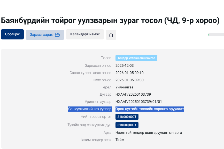 ОРОН ГЭРГҮЙ, СОГТУУ ЭТГЭЭДИЙН ШАТААСАН БАЯНБҮРДИЙН ТОЙРГИЙН УУЛЗВАРЫН ХӨШӨӨНИЙ ЗУРАГ ТӨСЛИЙГ 318 САЯ ТӨГРӨГӨӨР ХИЙЛГЭХ ТЕНДЕР ЗАРЛАЖЭЭ