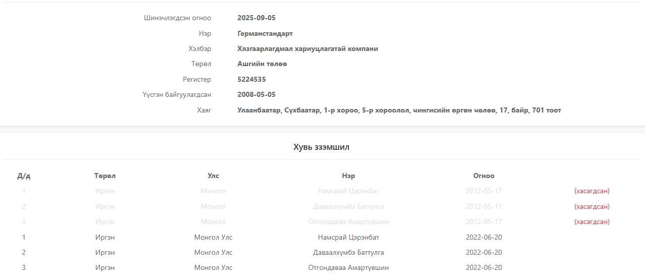 “Грийнпинус” ХХК-ийн хувьцаа эзэмшигчээр Аюурзанын Хадбаатар, Баянмөнхийн Сугарсүрэн бүртгэлтэй. Үүсгэн байгуулагч нь Х.Баямөнх аж. Хувьцаа эзэмшигч А.Хадбаатар нь “Гэрэгэ тауэр”-ын 14 дүгээр давхрын өмчлөлийн хэрэгт холбогдож, цагдан хоригдсон гэх Д.Хишигбаярын хадам дүү ажээ. Д.Хишигбаярын эхнэр Б.Нандин-Эрдэнийн дүү Б.Насан-Эрдэнэ “Грийнпинус” ХХК-ийн нягтлан бодогчоор ажилладаг.