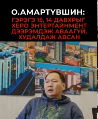 Харин Д.Хишигбаяр “2021 оны арваннэгдүгээр сард “Гэрэгэ” тауэрын 14 давхрыг манай компани шилжүүлж авч байсан. Улмаар Ерөнхий сайд асан Л.Оюун-Эрдэнэ, Б.Баатар нарын эзэмшлийн “Херо” энтертайнмент компанид нэг сая ам.доллароор худалдах гэрээ хийн тус барилгад оруулж байсан. Үүнээс хойш гурван жилийн хугацаанд ямар ч төлбөр хийлгүй ашиглаж ирсэн. 2025 оны нэгдүгээр сард надад гэнэт хэрэг тохож, 19 хоног цагдан хориулж, тэр хугацаандаа 14 давхрыг үнэ төлбөргүй шилжүүлж авсан. Ямар ч мөнгө төлөөгүй. Гэтэл энэ талаарх мэдээлэл олон нийтэд ил болж, бид уг асуудлыг “Энэ бол дээрэм” гэдгийг зарлах үед тэд ичсэндээ 1.5 тэрбум төгрөгийг манай компанийн данс руу хийсэн байсан" хэмээн мэдэгдсэн юм.
